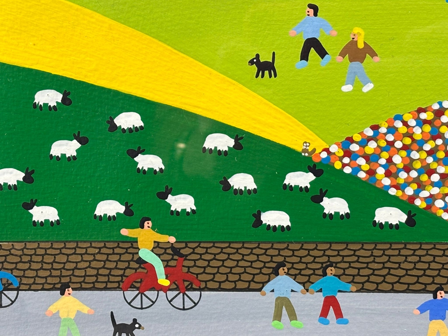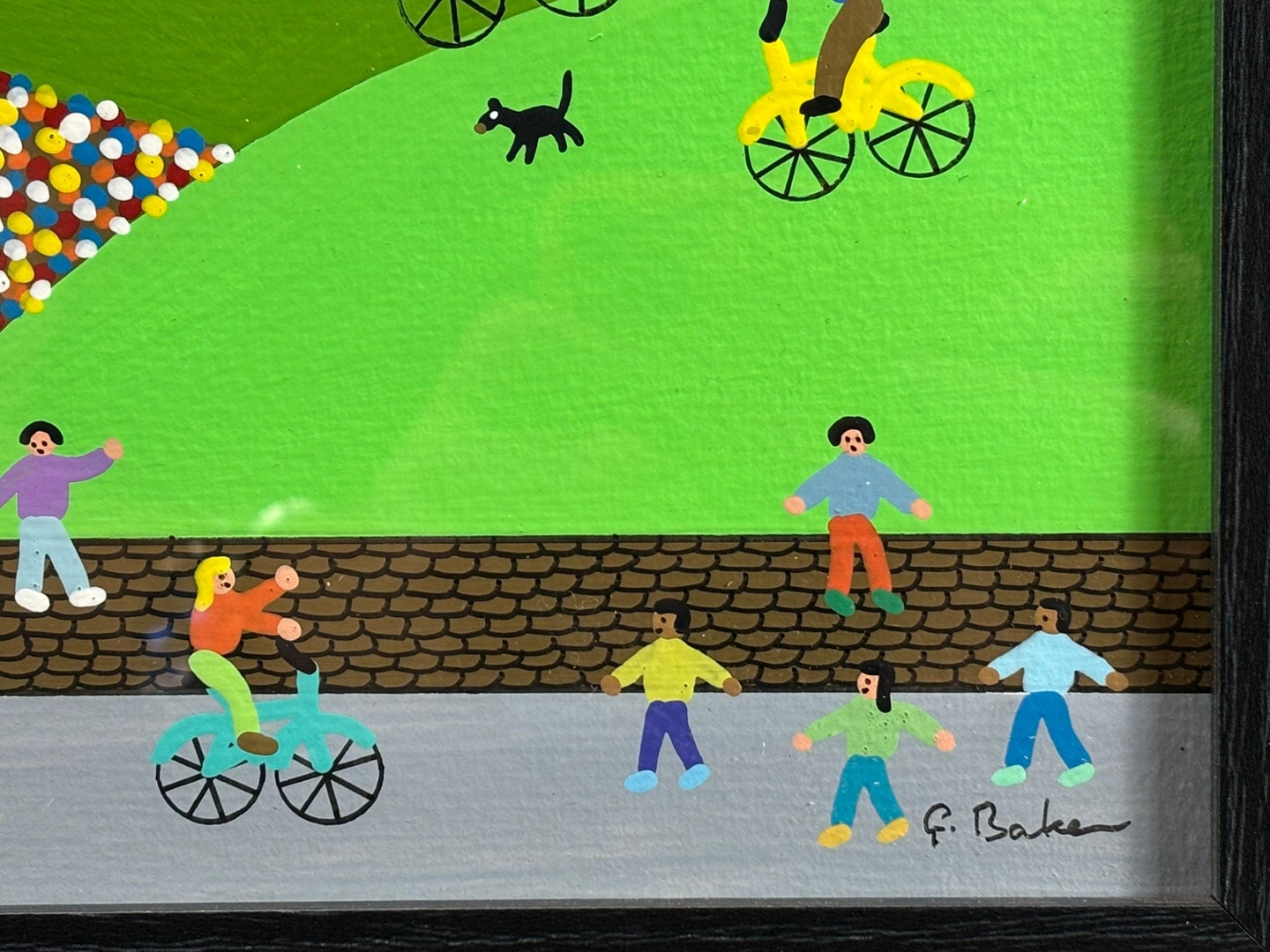 A vibrant original oil painting by British artist Gordon Barker, titled ‘On A Wonderful Summers Day’, presented in a sleek black frame and measuring approximately 35cm in height and 65cm in width. Barker’s distinctive naïve style has been developed over many years, earning him recognition with works held in private and corporate collections worldwide. His paintings are admired for their playful storytelling and instantly recognisable, uplifting character.