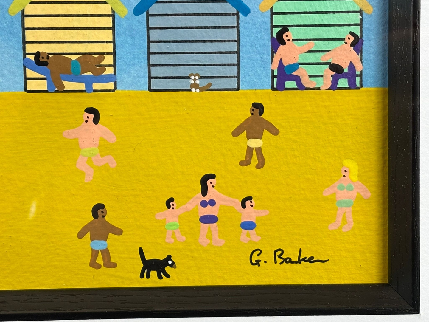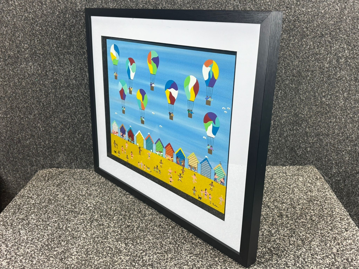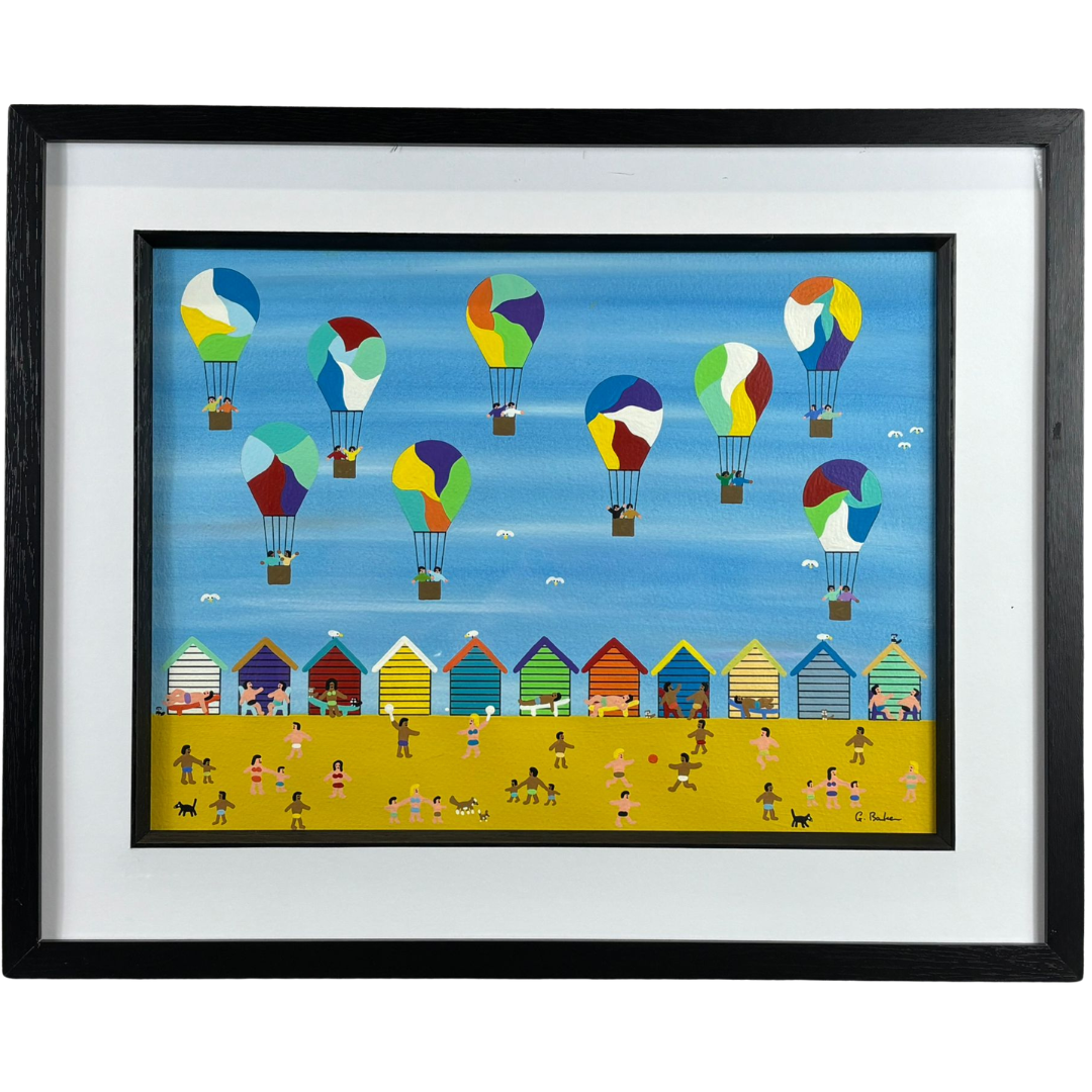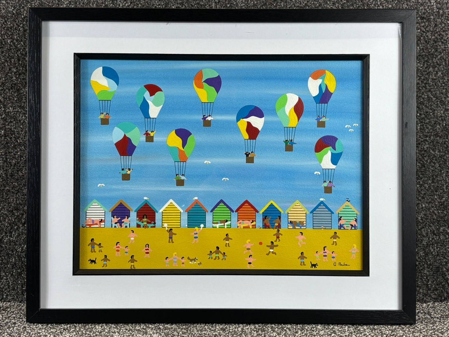A vibrant original oil painting by British artist Gordon Barker, titled ‘Seaside Balloons’, presented in a smart black frame with mount and measuring approximately 43cm in height and 53cm in width. Barker’s distinctive naïve style has been developed over many years, with his work now held in private and corporate collections worldwide. His paintings are widely recognised for their playful storytelling and bold, uplifting character.