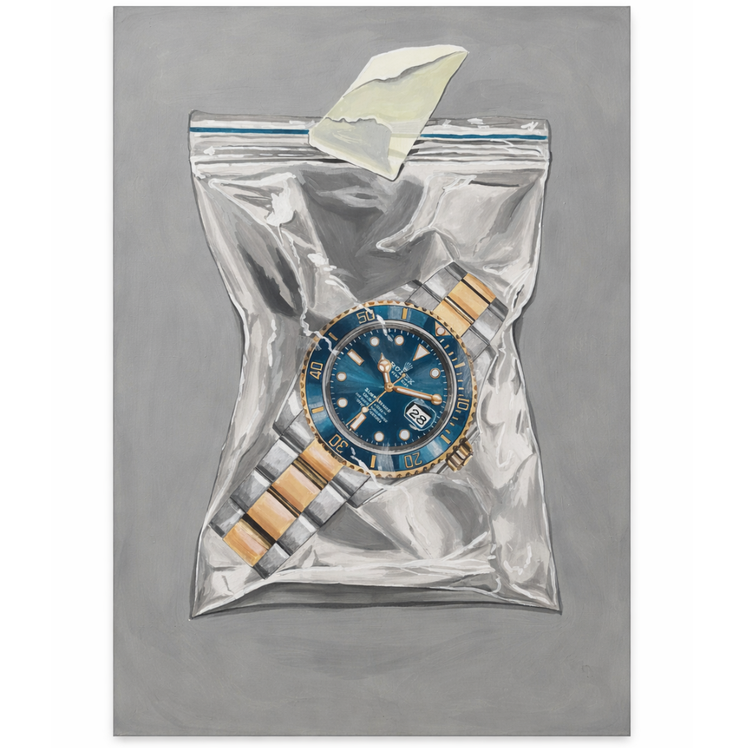 A bold and contemporary original oil painting by Liam Jacobi, capturing a striking juxtaposition between luxury and everyday imagery. The composition features a Rolex GMT watch encased within a sealed bag, set against a muted grey canvas background that enhances the contrast and draws immediate focus to the vibrant blue dial and two-tone bracelet. The hyper-realistic execution and attention to detail bring both the watch and surrounding textures to life.