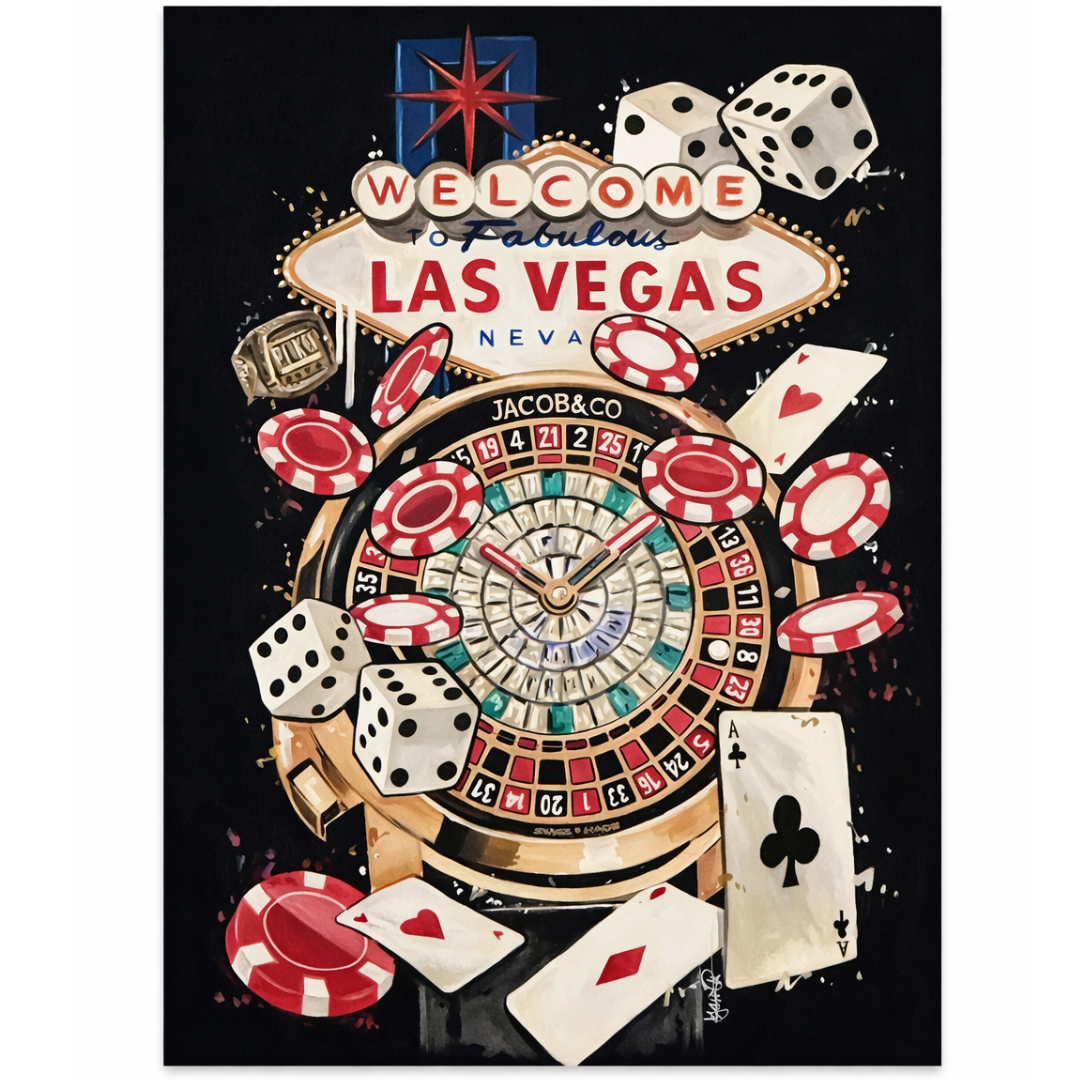 A bold and visually dynamic original oil painting by Liam Jacobi, inspired by the unmistakable energy of Las Vegas and the intricate design language of Jacob & Co. The composition centres around a highly detailed casino-style watch, surrounded by iconic elements including poker chips, dice, and playing cards, all set beneath the instantly recognisable “Welcome to Fabulous Las Vegas” sign.