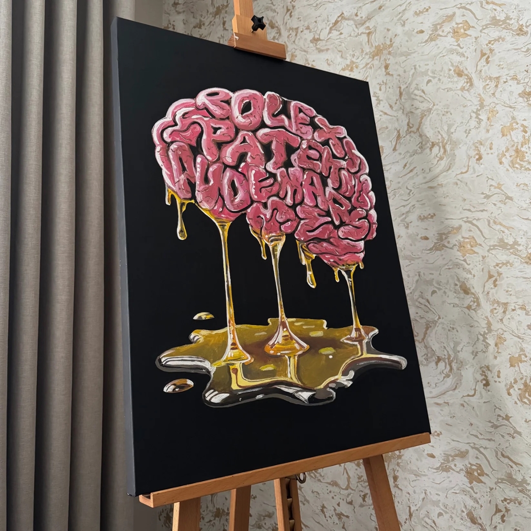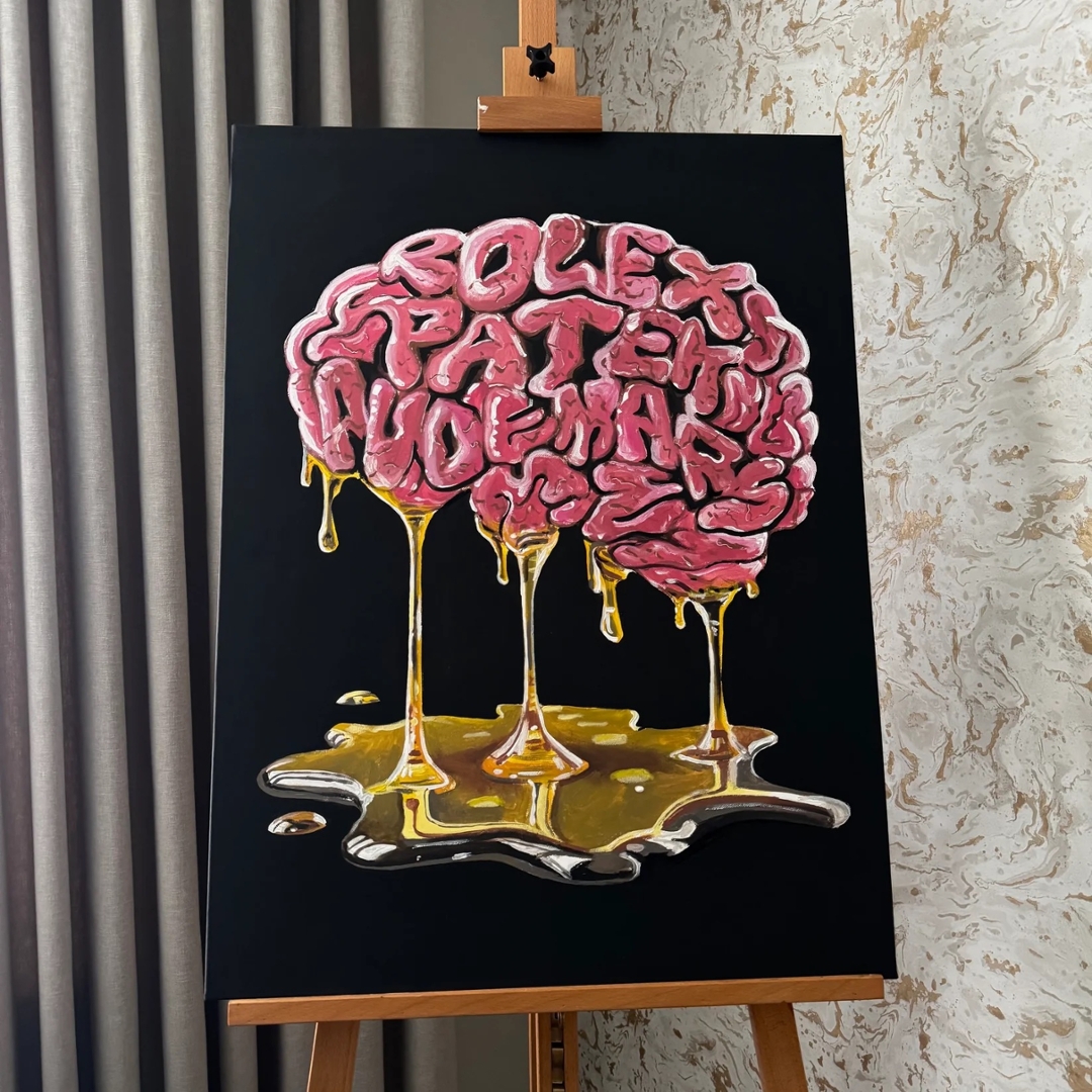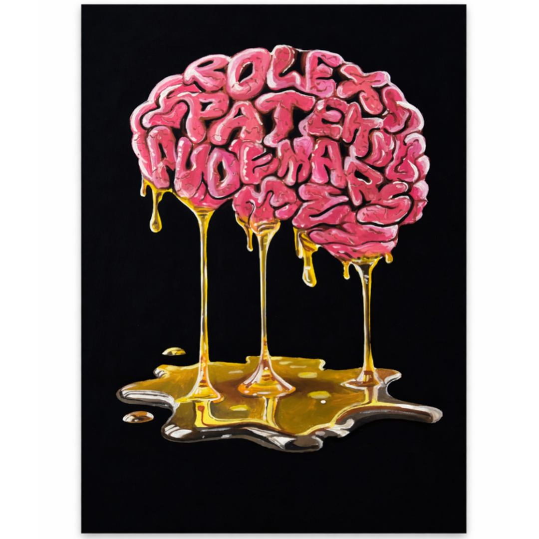 A striking original oil painting by Liam Jacobi titled Watches On The Mind, presented in a bold and contemporary style that immediately captures attention. The composition features a stylised brain formed from fluid, sculptural lettering, with the words seamlessly integrated into its shape, creating a powerful visual link between obsession, luxury, and identity.