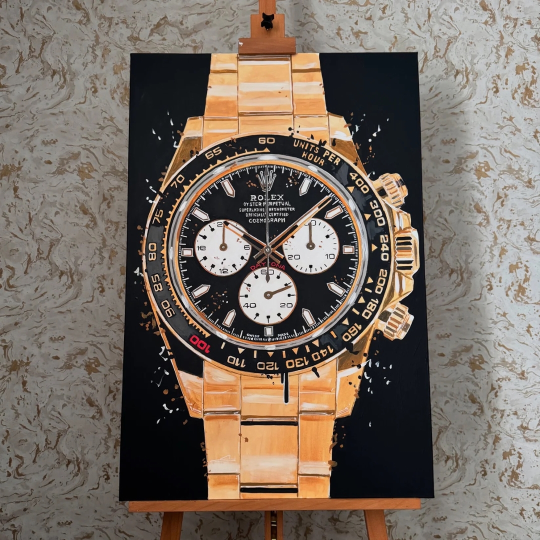A striking original oil painting by Liam Jacobi, capturing the unmistakable presence of the Rolex Le Mans Daytona. Executed in warm gold tones against a deep, contrasting backdrop, the composition highlights the bold chronograph layout, tachymeter bezel, and distinctive dial details with confident, expressive brushwork. Subtle splatter accents and layered texture bring energy and movement, giving the piece a contemporary edge while celebrating one of Rolex’s most iconic designs.