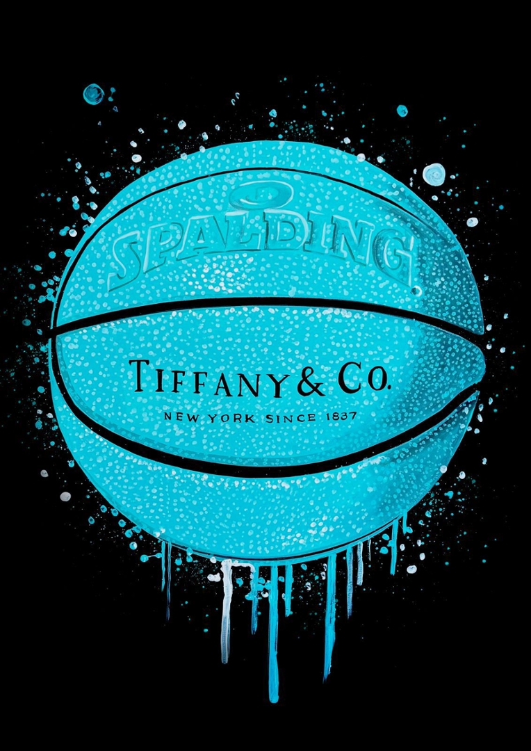 A striking original painting by Liam Jacobi, featuring a Tiffany & Co. inspired basketball set against a deep, dark backdrop. The iconic Tiffany blue sphere is rendered with bold texture and layered detailing, while the signature branding sits cleanly across the centre, creating an immediate visual impact. Subtle paint drips and splatter accents introduce movement and energy, blending luxury symbolism with a contemporary street-art influence.