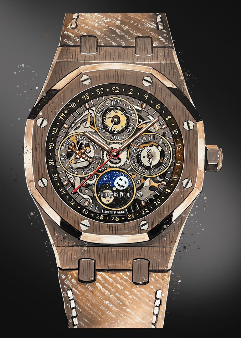 An original painting by the artist Liam Jacobi of an Audemars Piguet Royal Oak Cactus Jack Watch.