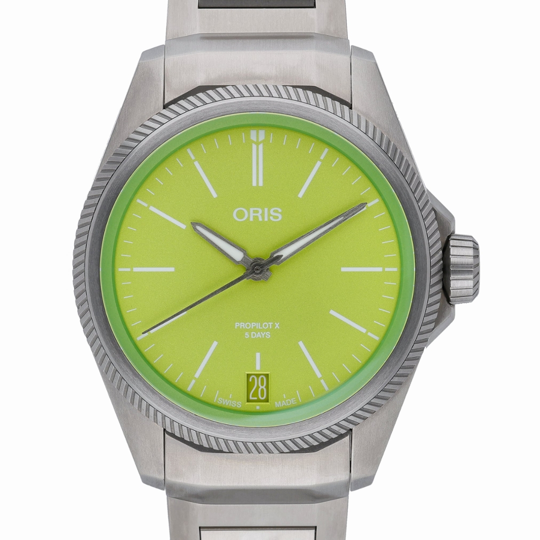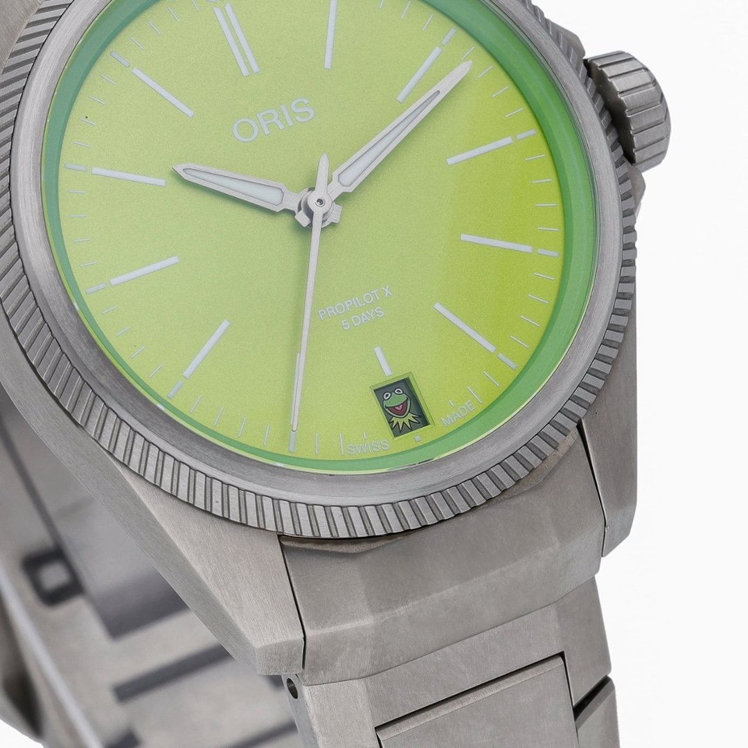 An Oris ProPilot X Kermit Edition reference 01 400 7778 7157 is presented in lightweight titanium, featuring a 39mm case paired with a matching titanium bracelet and the brand’s distinctive lift-style clasp. The watch is defined by its lime-green dial, accented with crisp applied indices and hands, and the playful Kermit date aperture at 6 o’clock, adding a subtle yet recognisable signature to the design. The fluted titanium bezel reinforces the ProPilot’s aviation-inspired aesthetic.