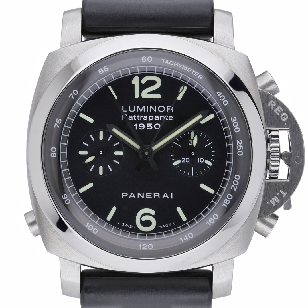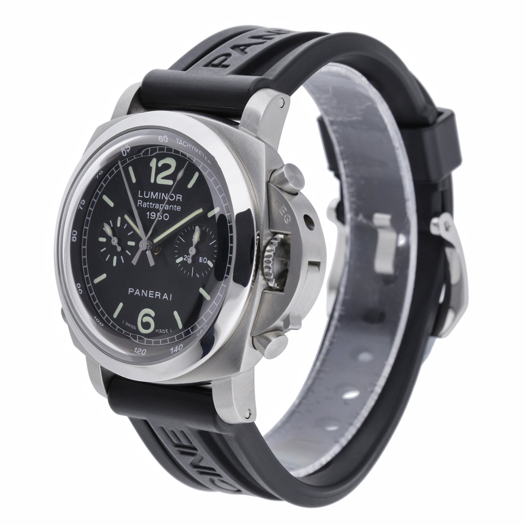 A Panerai Luminor 1950 Rattrapante Chronograph, reference PAM00213, in stainless steel showcases the bold, highly functional design language synonymous with the brand. The 44mm cushion-shaped case features the iconic crown-protecting bridge, delivering strong wrist presence and unmistakable identity, while the black strap complements its utilitarian, sport-driven aesthetic.