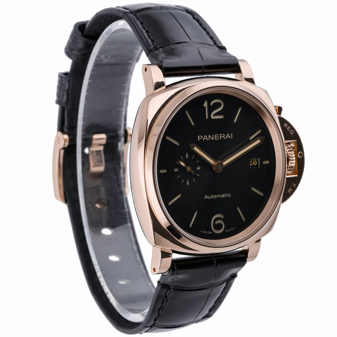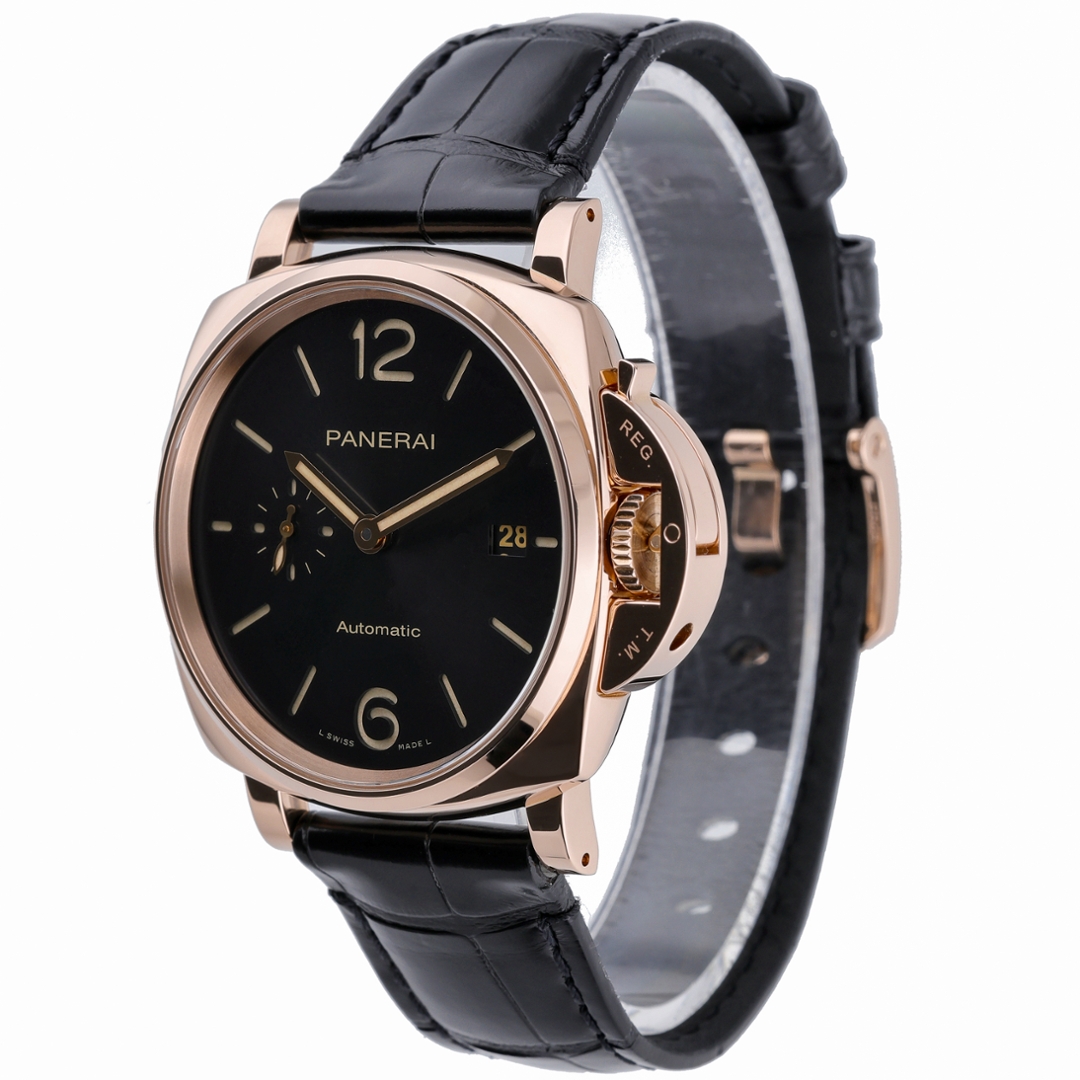 A Panerai Luminor Due Watch, Black Leather Strap with an 18ct Rose Gold Case & Clasp and a Black Dial