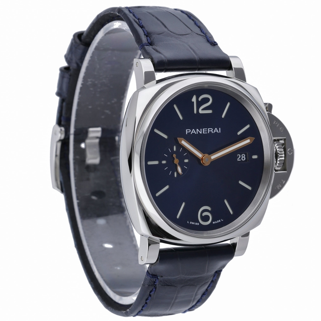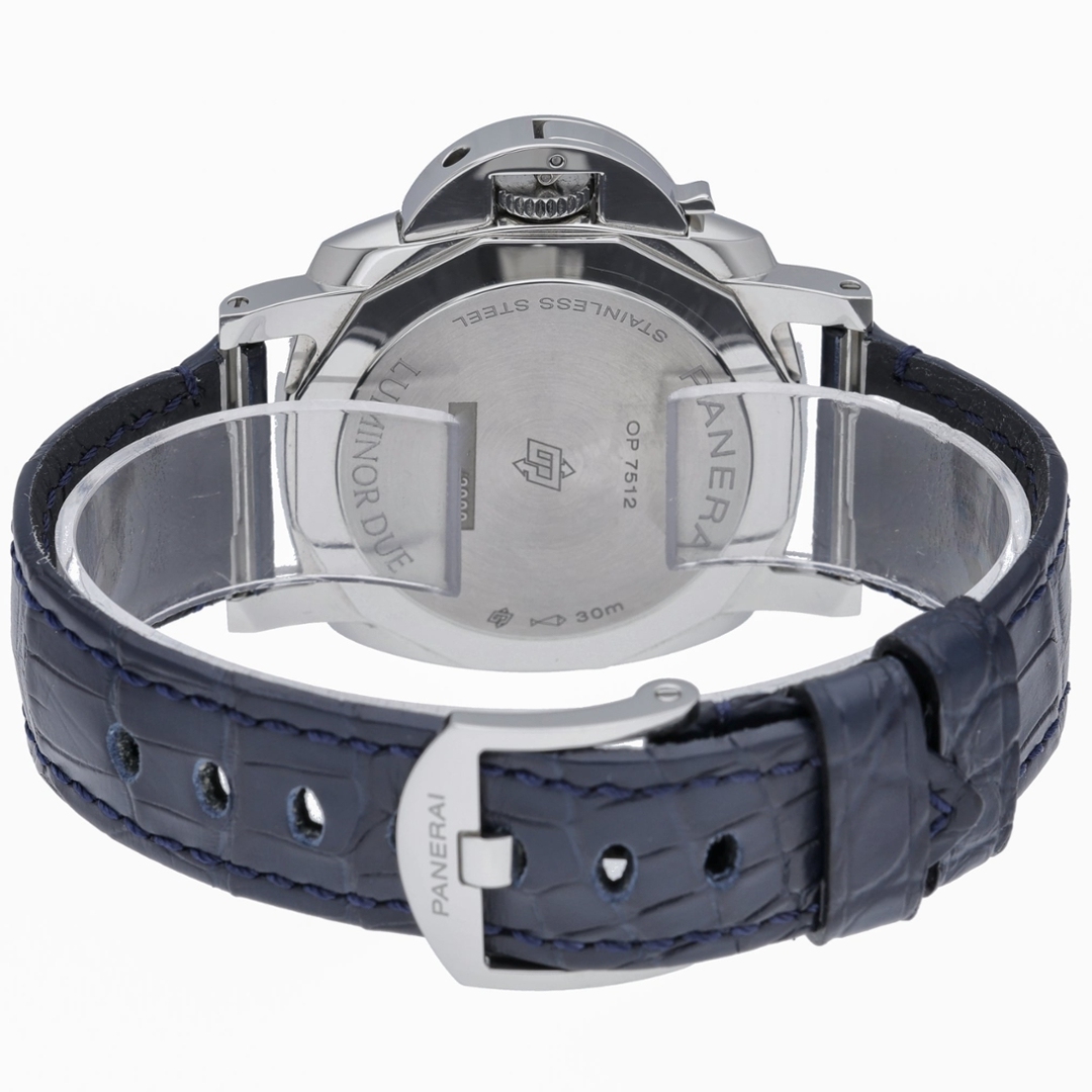A Panerai Luminor Due Watch, Blue Leather Strap with a Stainless Steel Case & Clasp and a Blue Dial