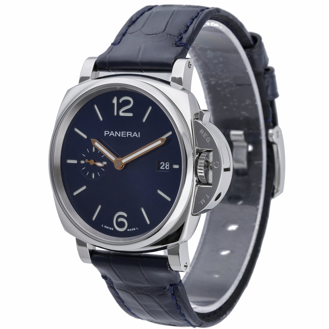 A Panerai Luminor Due reference PAM01274 is presented in stainless steel with a refined 42mm case and matching steel clasp, paired with a blue leather strap that complements the rich sun-brushed dial. The polished case retains the signature Luminor crown-protecting bridge, delivering unmistakable Panerai character in a slimmer, more versatile profile. The dial features luminous hour markers, bold hands with beige-toned lume, a small seconds display at nine o’clock, and a date aperture at three, offering balanced symmetry and strong legibility.