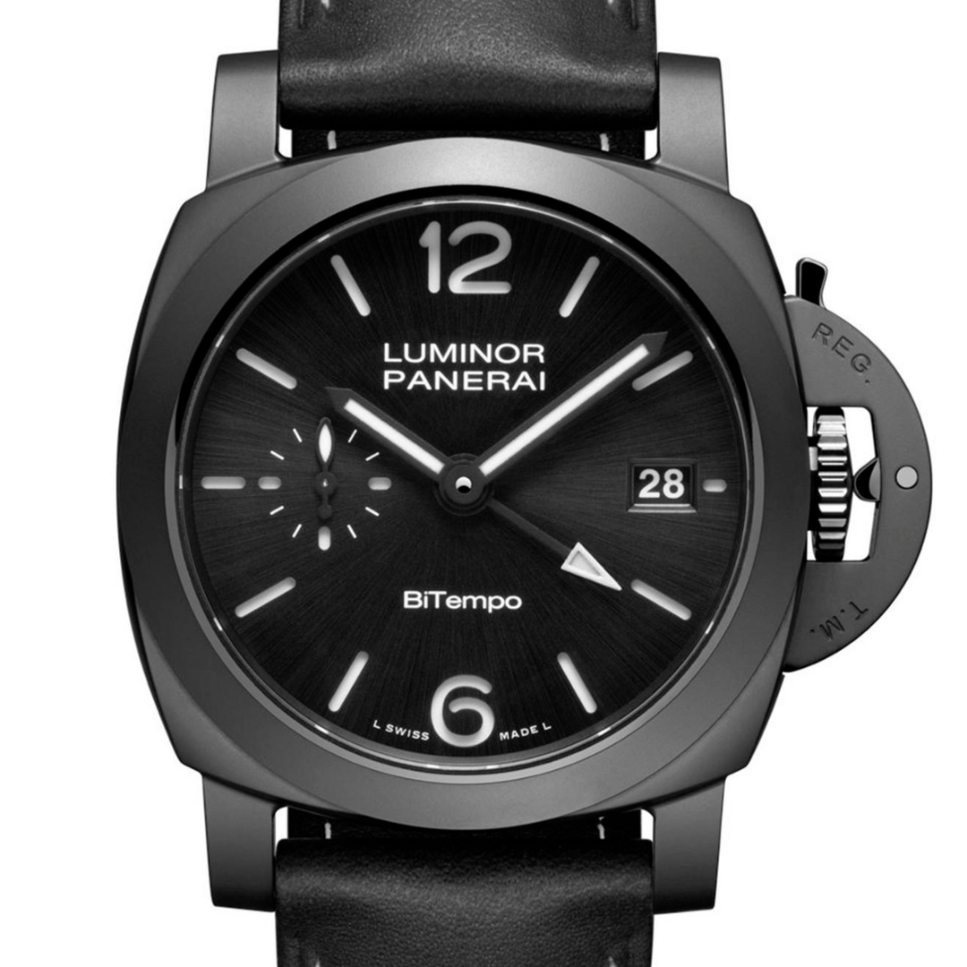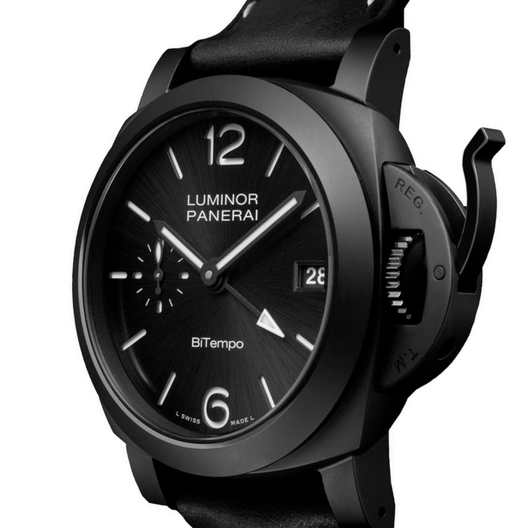 A Panerai Luminor BiTempo GMT PAM01460 presented in a black ceramic case, paired with a black leather strap and titanium clasp. Sized at 40mm, this model offers a more wearable take on the Luminor while retaining the signature crown guard bridge. The black sun-brushed sandwich dial provides strong depth and legibility, with Super-LumiNova® Arabic numerals and markers, a clearly defined GMT hand, date at 3 o’clock and small seconds at 9, delivering practical functionality in a clean layout.