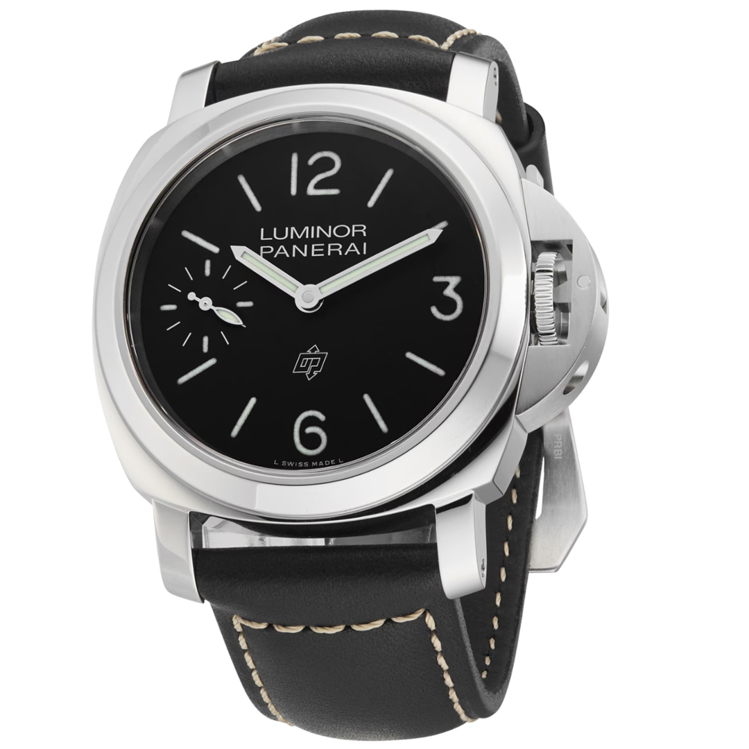 A Panerai Luminor Logo PAM01084 presented in stainless steel, paired with a black leather strap and the brand’s signature cushion-shaped 44mm case. Instantly recognisable, this model features the iconic crown guard bridge and a clean black dial layout, enhanced by luminous Arabic numerals and baton markers for exceptional legibility. The OP logo at 6 o’clock adds a distinctive touch, staying true to Panerai’s heritage-inspired design language and military roots.