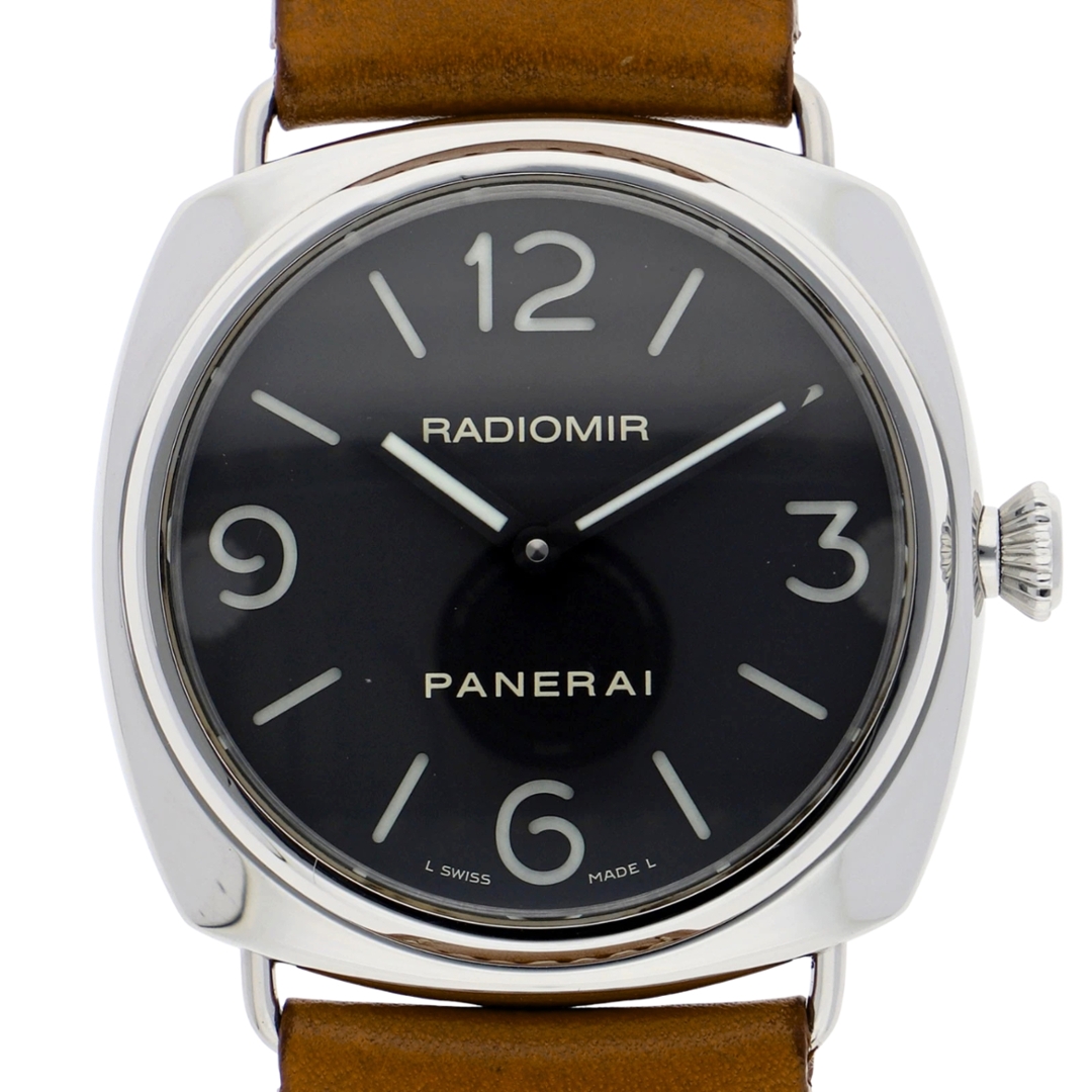 A Panerai Radiomir Watch, model PAM00210, crafted in stainless steel and presented on a brown leather strap with a stainless steel clasp. The substantial 45mm cushion-shaped case reflects the historic design language of the Radiomir collection, a model originally developed for Italian naval commandos in the 1930s. Its clean black dial features large luminous Arabic numerals and baton markers.