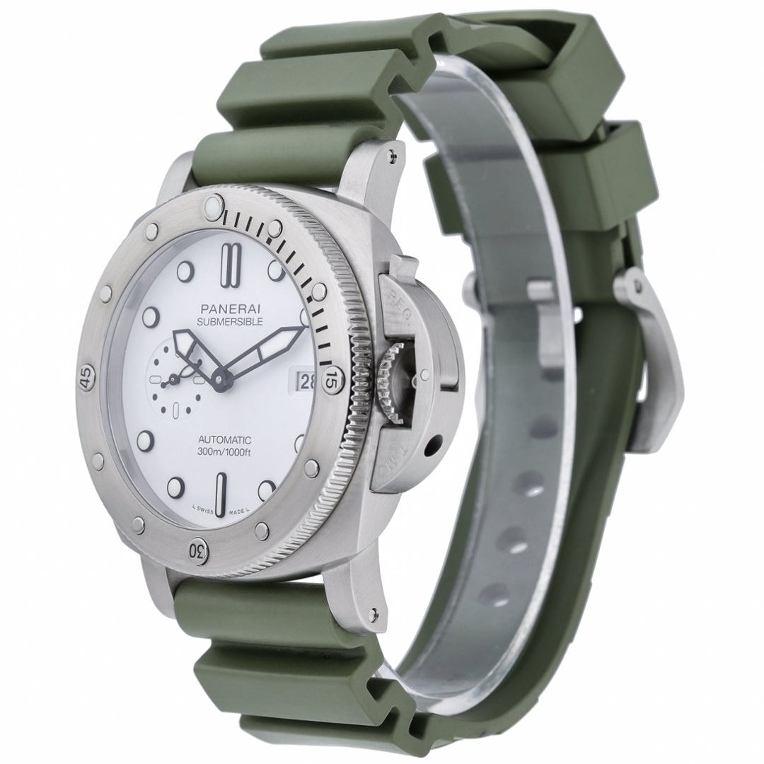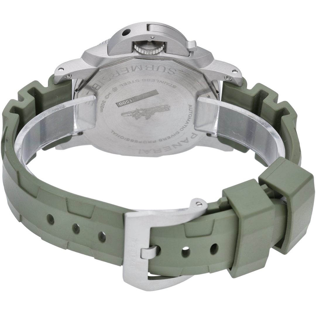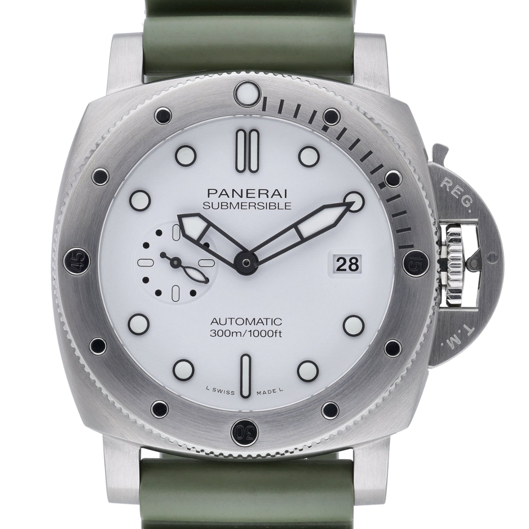 A Panerai Submersible QuarantaQuattro Watch, Green Rubber Strap with a Stainless Steel Case & Clasp on a White Dial