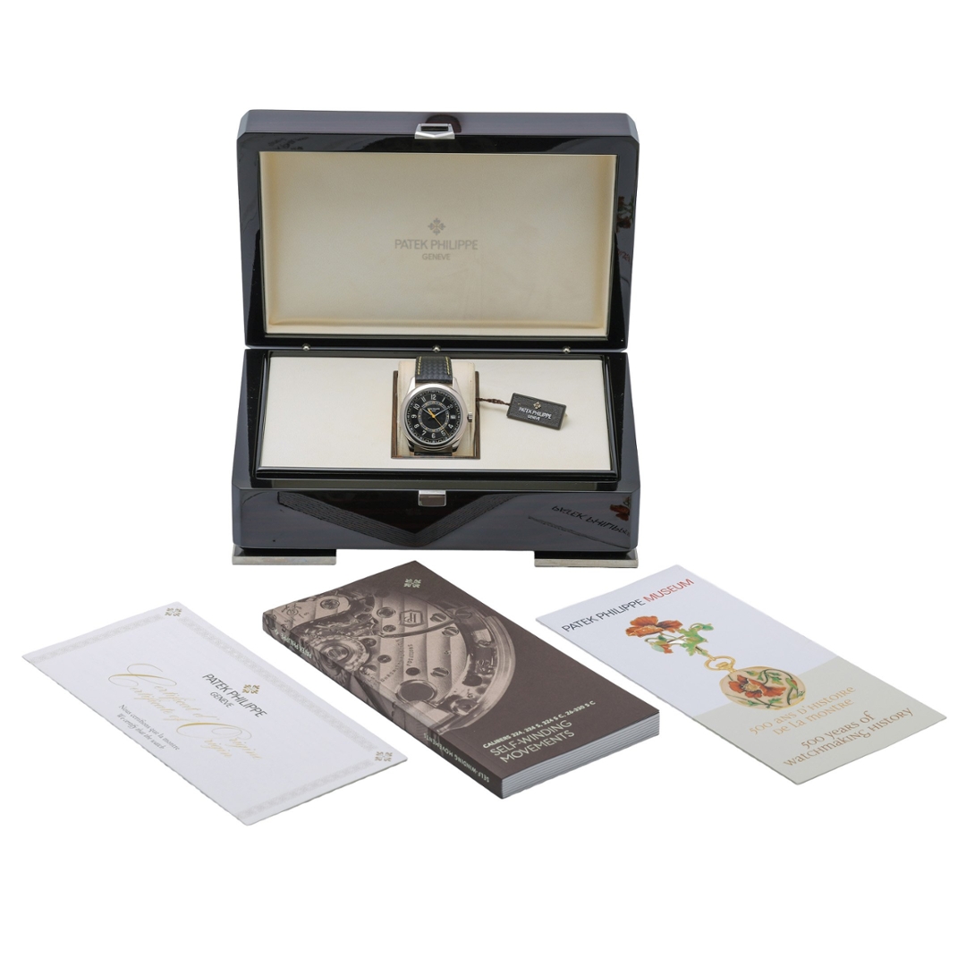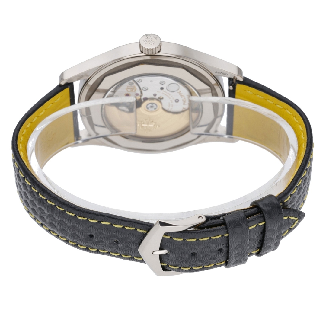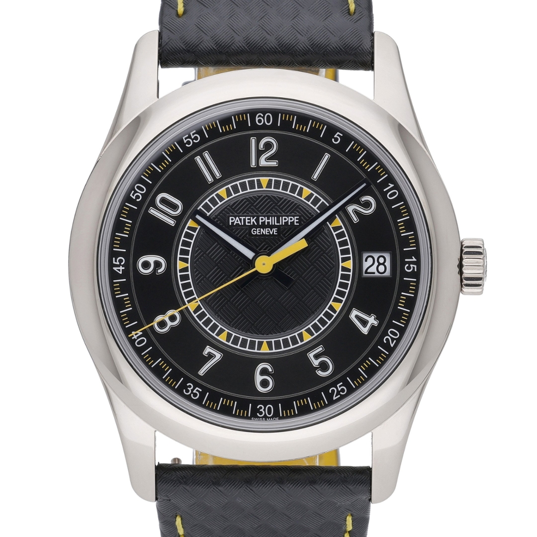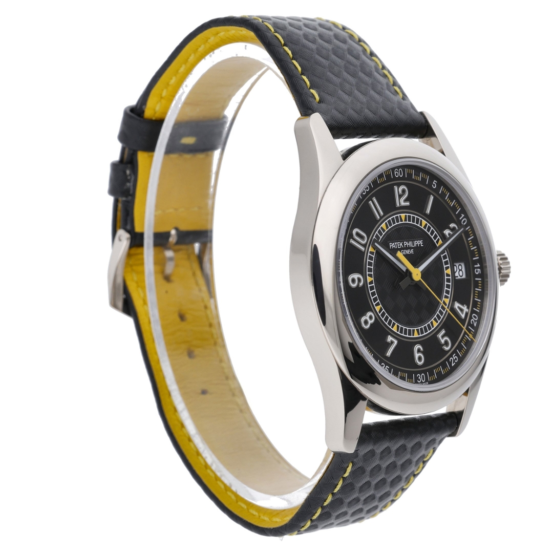 A Patek Philippe Calatrava, reference 6007G-001, is a striking interpretation of Patek’s timeless design language infused with contemporary flair. Crafted from 18ct white gold, this 40mm model features a textured black dial enhanced by luminous Arabic numerals, vibrant yellow accents, and a fine guilloché centre — an elegant nod to the brand’s meticulous craftsmanship. The black calfskin strap, detailed with matching yellow stitching, adds a modern and sporty edge to the classic Calatrava silhouette.