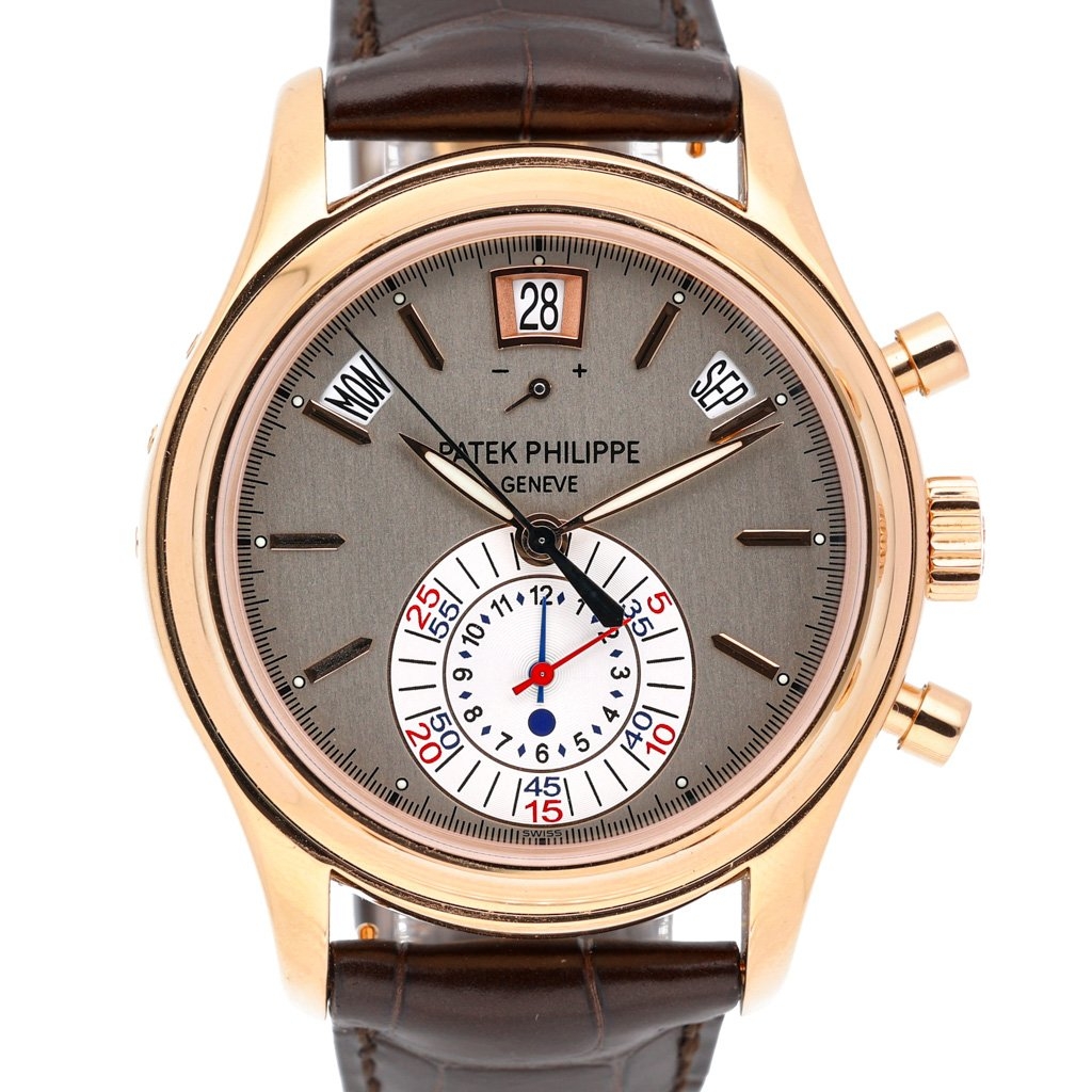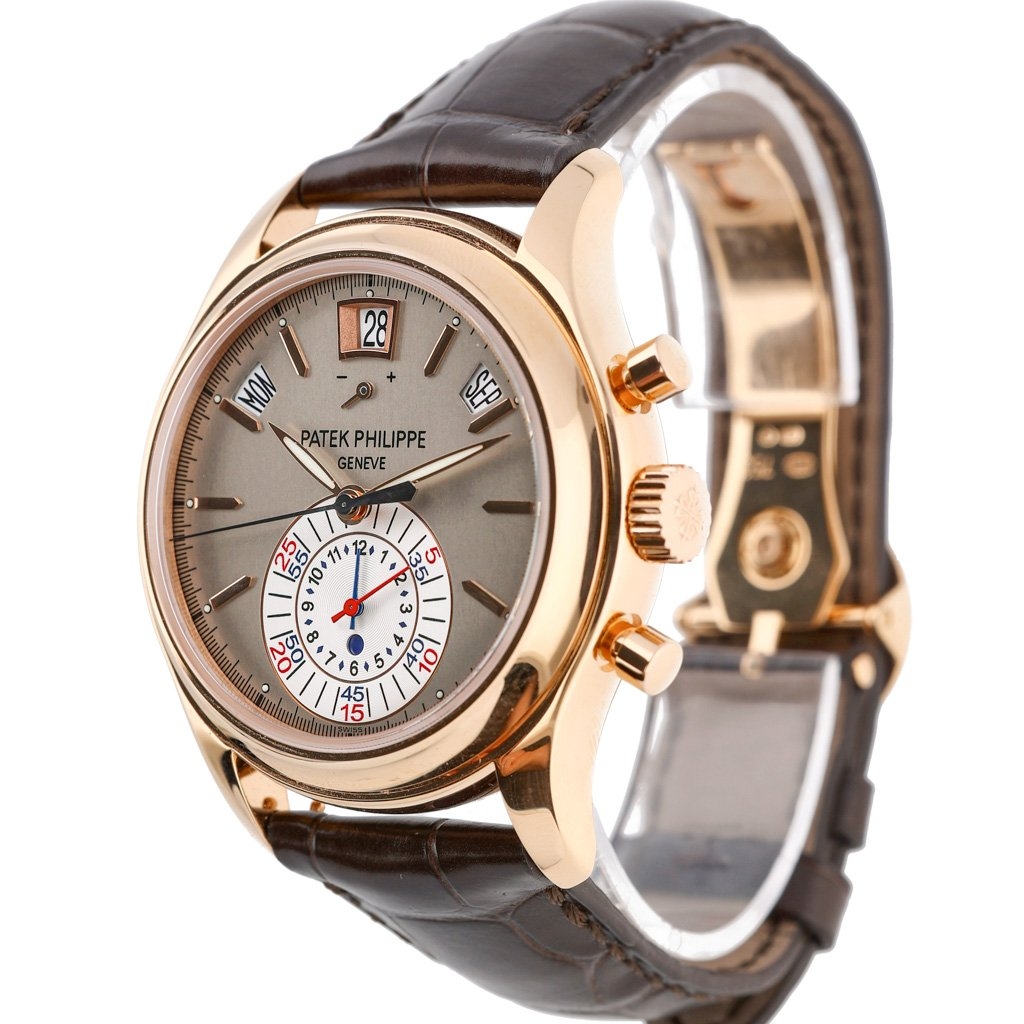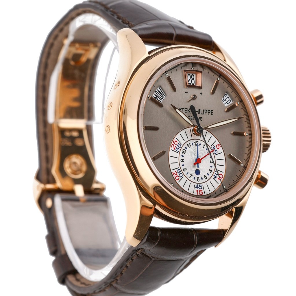 A Patek Philippe Annual Calendar Chronograph Watch, Brown Leather Strap with an 18ct Rose Gold Case & Clasp on a Grey Dial