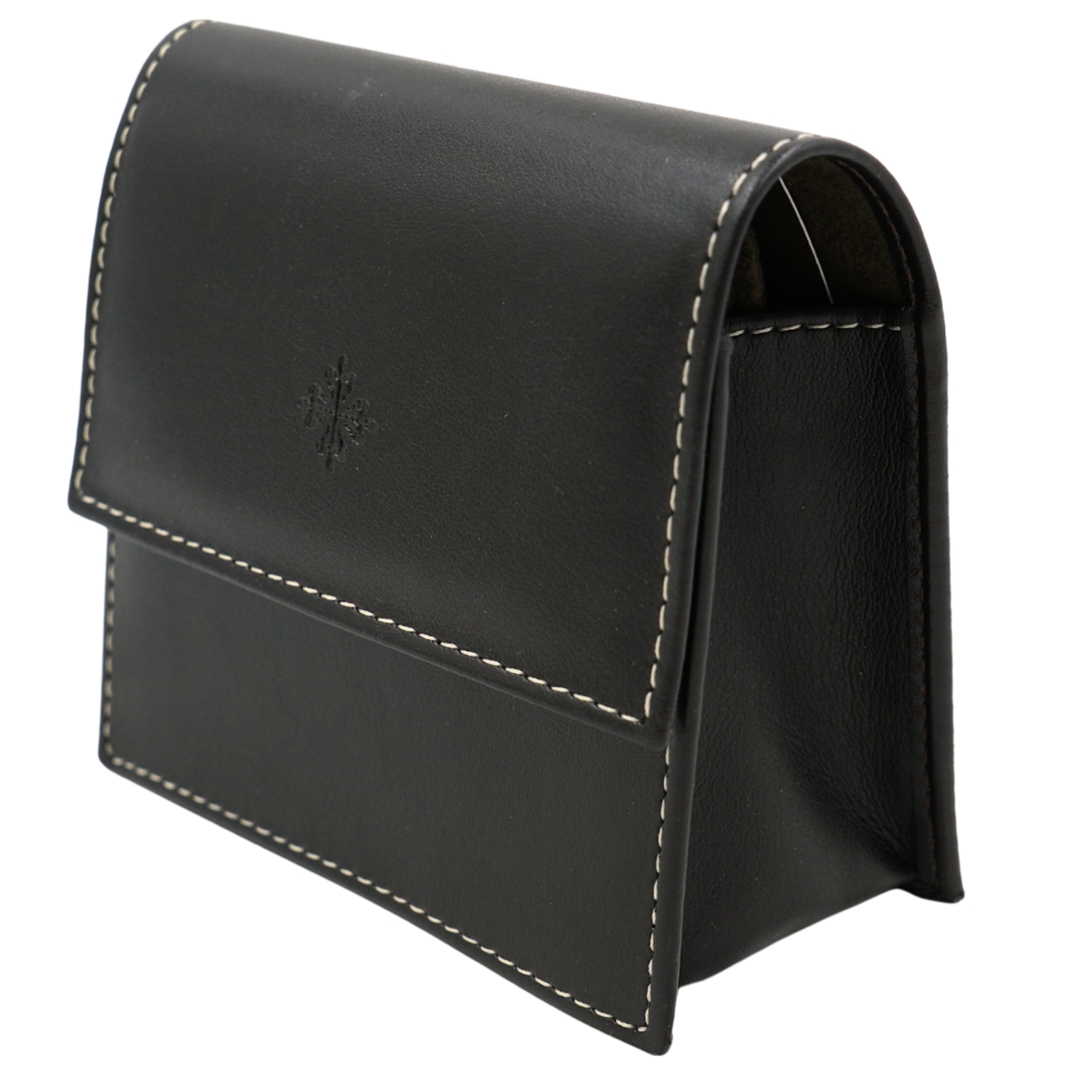 A Patek Philippe square travel case crafted in smooth black leather, reflecting the maison’s understated approach to functional luxury accessories. The exterior presents a clean, structured silhouette with contrasting light stitching and a discreetly embossed Calatrava cross to the flap, offering subtle brand recognition while maintaining a timeless, elegant appearance.