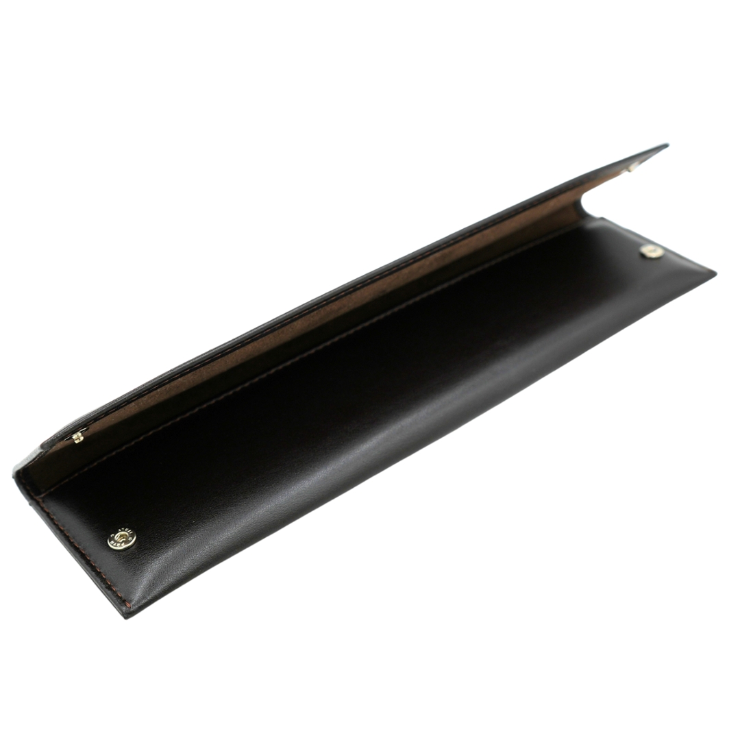 A Patek Philippe long travel case crafted in smooth brown leather, designed to house and protect fine accessories with the maison’s signature restraint and refinement. The exterior presents a slim, elongated silhouette with precise contrast stitching and a discreetly embossed Calatrava cross to the centre, offering understated brand recognition. The rich brown tone and clean lines give the piece a timeless, versatile appearance.