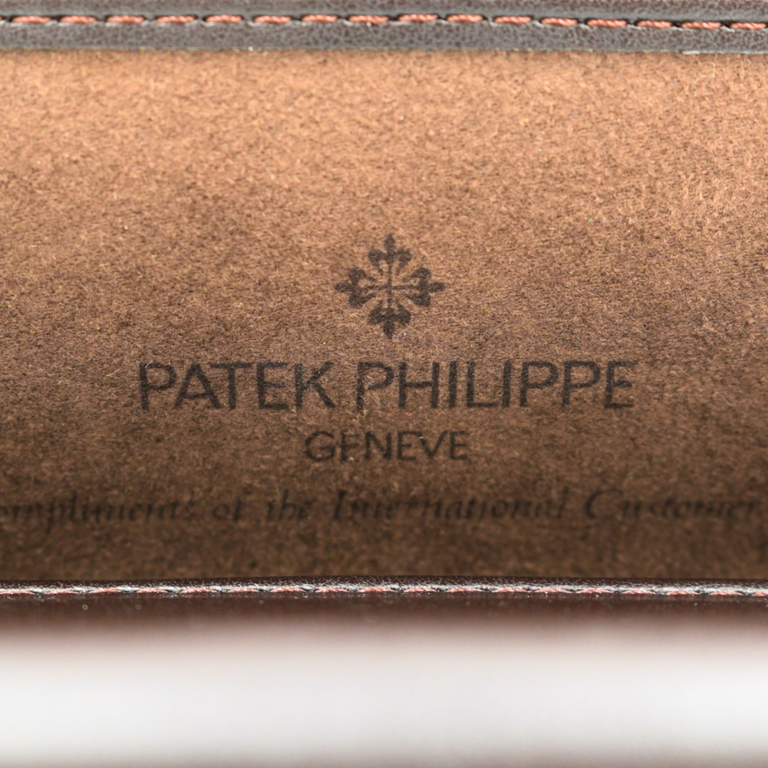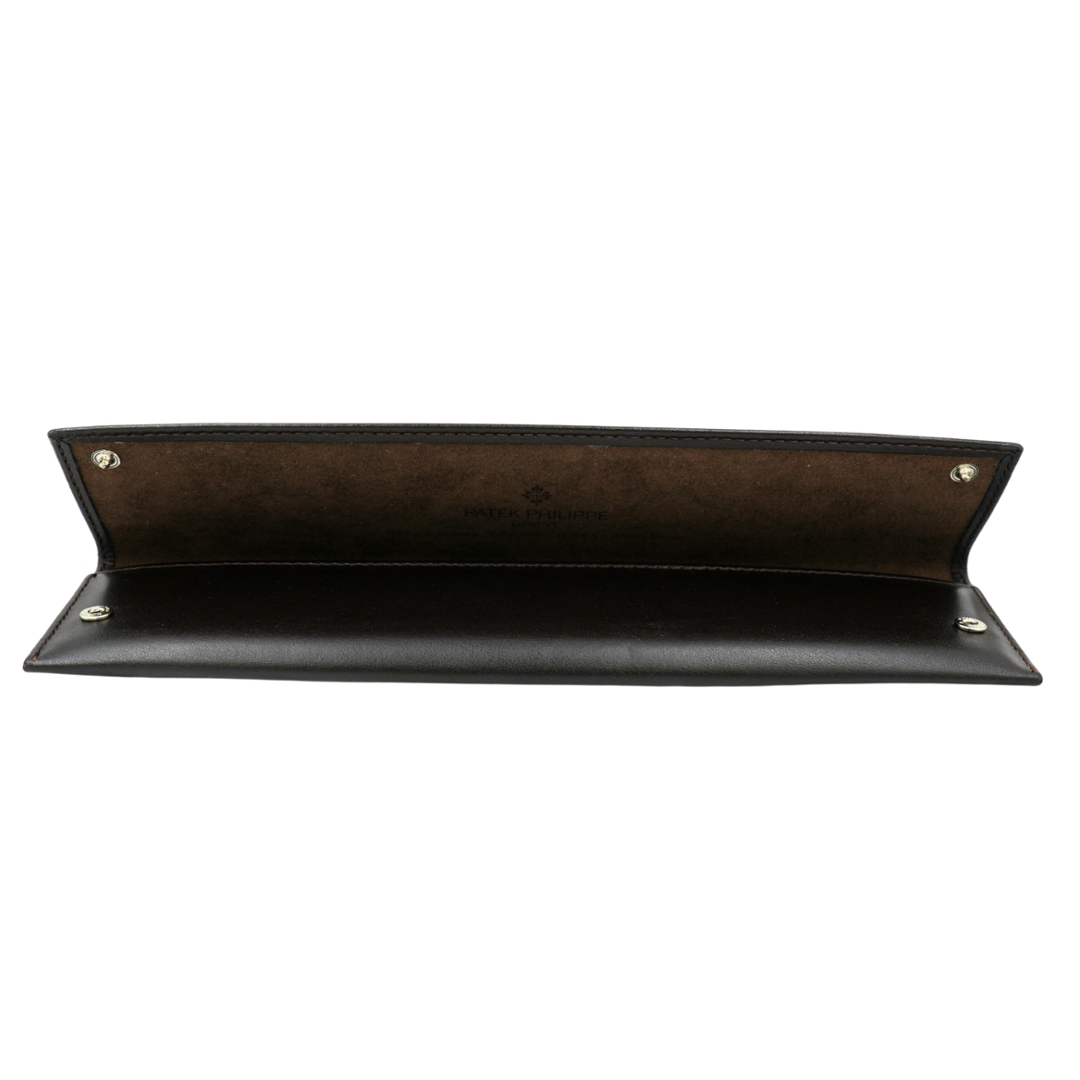 A Patek Philippe long travel case crafted in smooth brown leather, designed to house and protect fine accessories with the maison’s signature restraint and refinement. The exterior presents a slim, elongated silhouette with precise contrast stitching and a discreetly embossed Calatrava cross to the centre, offering understated brand recognition. The rich brown tone and clean lines give the piece a timeless, versatile appearance.