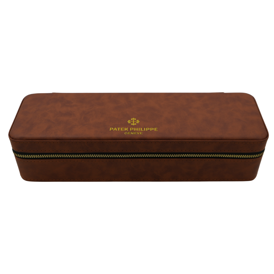 Presented here is a refined Patek Philippe leather watch travel case, designed to securely house up to five timepieces. Crafted in a rich brown leather exterior with a smooth zip closure, the case reflects the understated luxury and attention to detail synonymous with the brand.