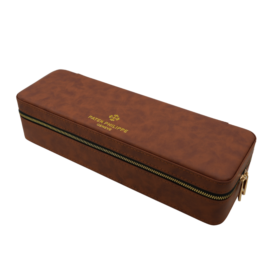 Presented here is a refined Patek Philippe leather watch travel case, designed to securely house up to five timepieces. Crafted in a rich brown leather exterior with a smooth zip closure, the case reflects the understated luxury and attention to detail synonymous with the brand.