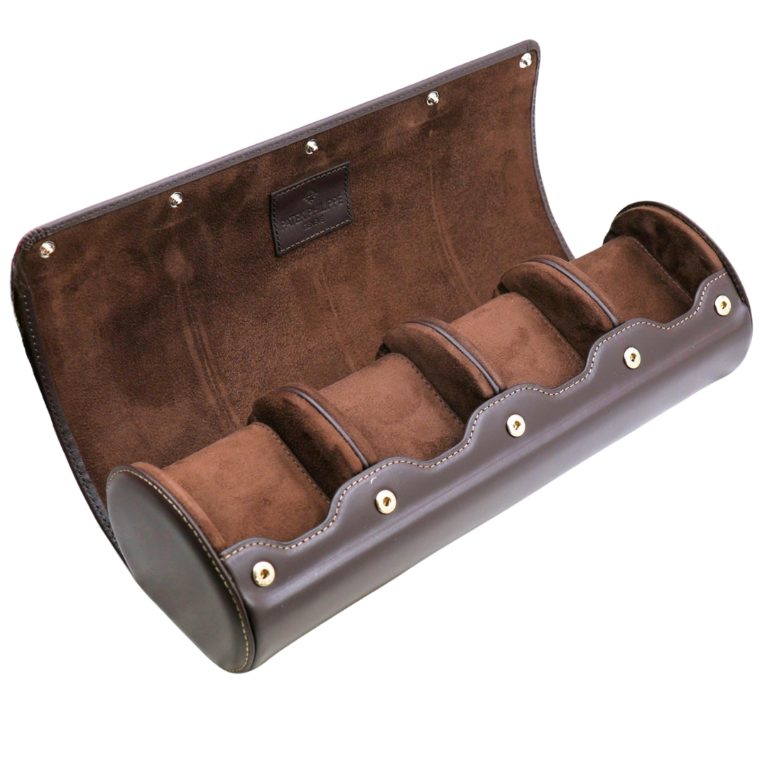 A Patek Philippe watch holder designed to store and present up to four wristwatches, crafted in rich brown leather with a softly contoured profile. The exterior showcases the maison’s understated luxury, with smooth leather panels, fine stitching, and a structured roll design that balances elegance with practicality. Subtle Patek Philippe Genève branding inside reinforces its association with one of watchmaking’s most prestigious names.