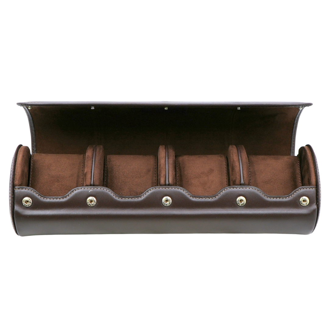 The interior is fully lined, with four individual padded compartments shaped to securely cradle each watch. The cushioned dividers help prevent contact between pieces, making this holder ideal for collectors who wish to store or transport multiple watches while maintaining protection and organisation. Stud fastenings allow the holder to be securely closed when rolled.
