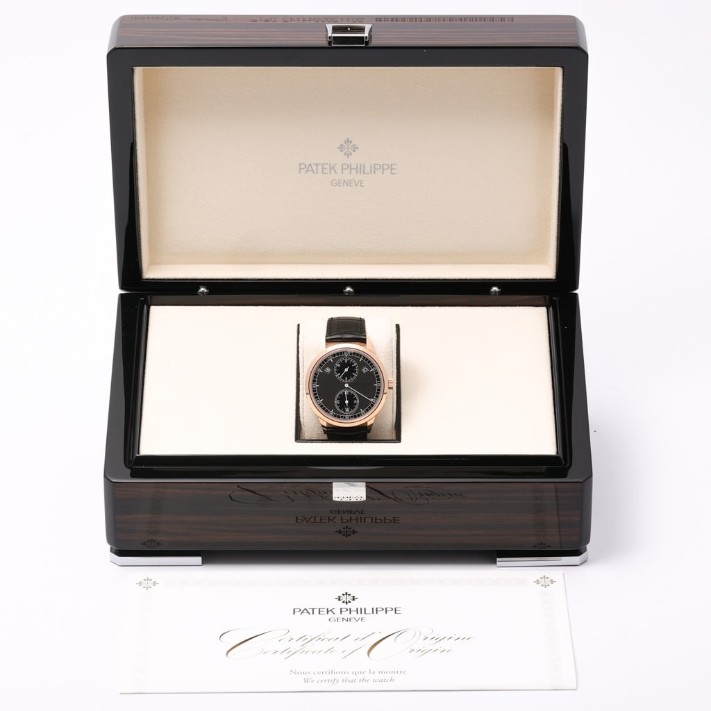A Patek Philippe Complications Watch, model 5235/50R-001, presented in immaculate condition. Crafted in 18ct rose gold, this 2023 reference features a distinctive grey dial with a regulator-style display, showcasing central minutes with offset hour and seconds subdials. Housed in a 40mm case and paired with a leather strap, it is powered by the manually wound Patek Philippe Calibre 31-260 REG QA movement. The watch is offered with its original Patek Philippe paperwork, presentation box, and a 12-month WLC warranty.
