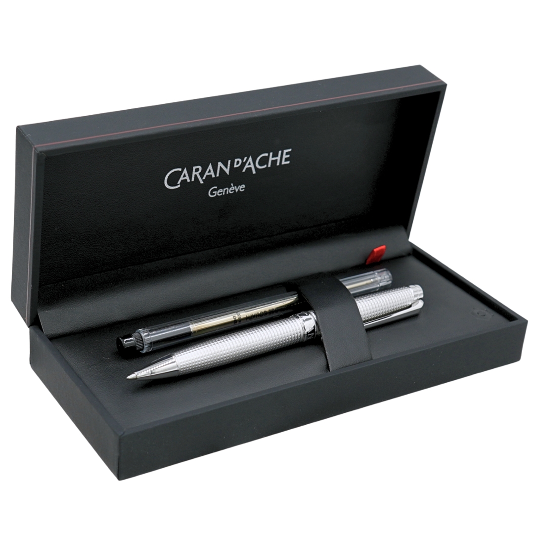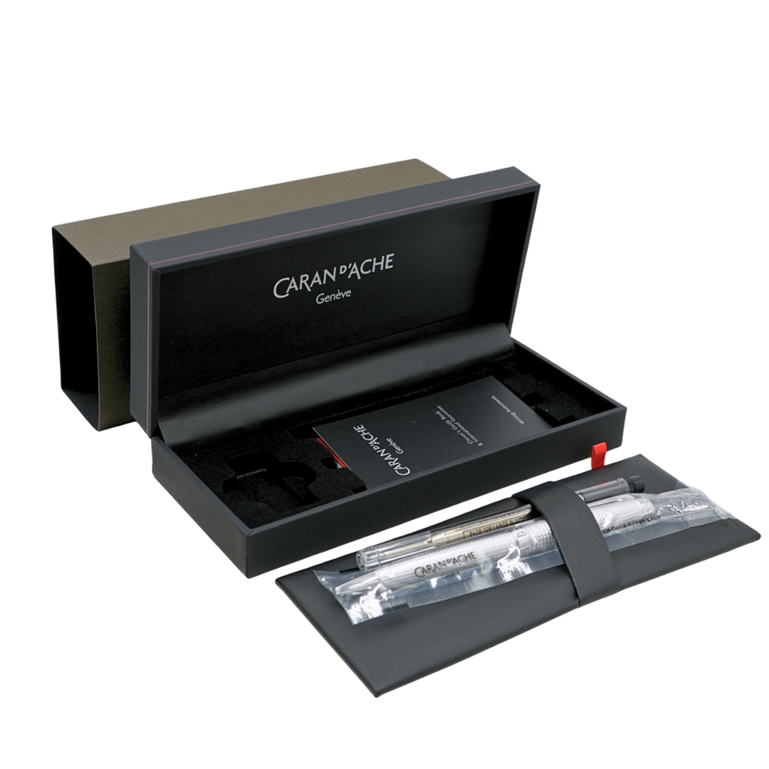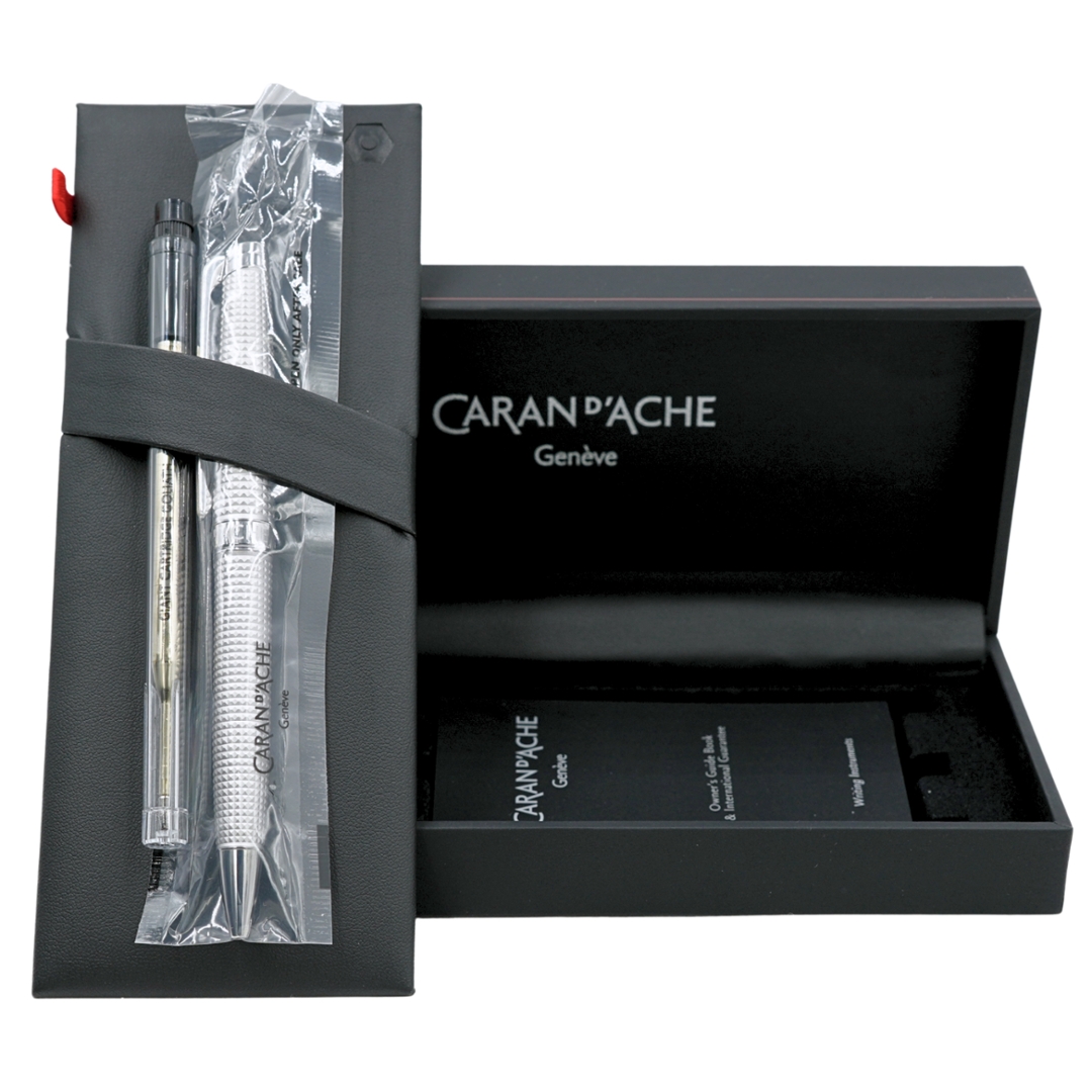 The pen features a beautifully textured silver-tone metal body, with Caran d’Ache’s iconic guilloché-style engraving that adds visual depth and a refined tactile feel. This finish catches the light beautifully, elevating it from a simple writing tool to a statement accessory. The set includes an additional branded refill, neatly held inside the case, ensuring long-lasting practicality alongside its elegant design.