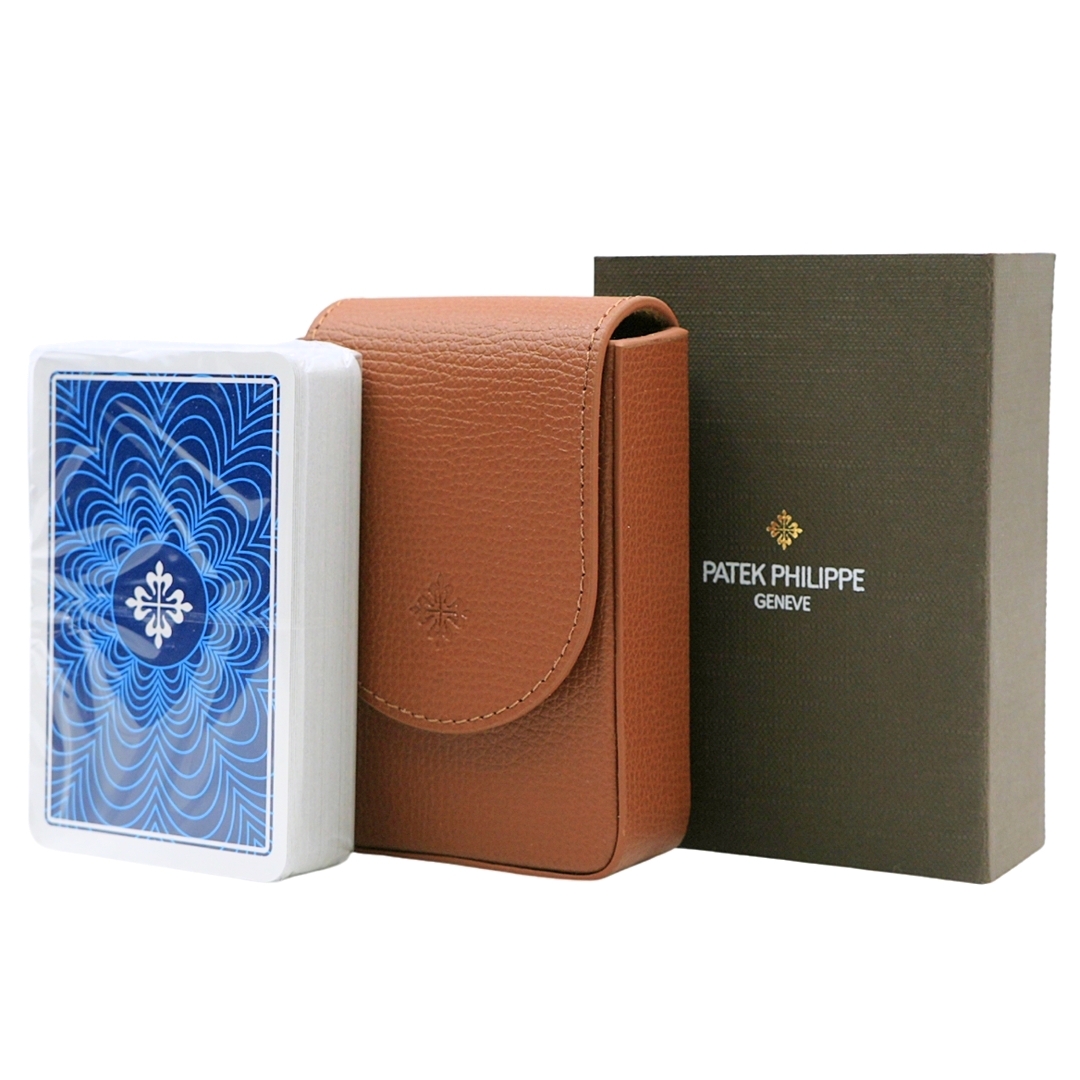 A refined Patek Philippe and playing card set, presented with its original branded leather carry case and outer packaging. This elegant accessory ensemble reflects the maison’s attention to detail beyond watchmaking, combining everyday practicality with unmistakable Geneva prestige.