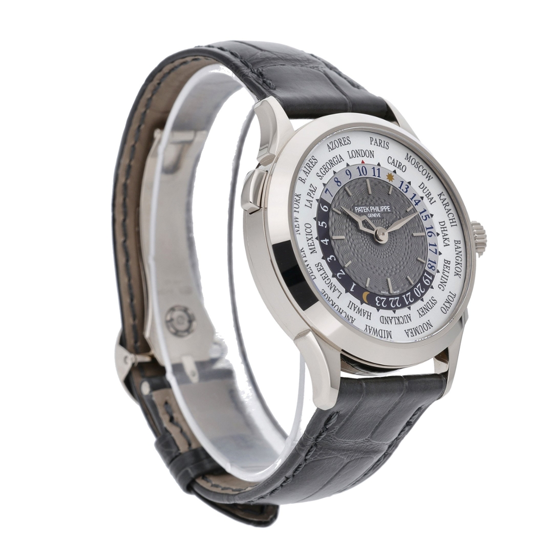 The 38.5mm white gold case strikes an elegant balance between tradition and wearability, complemented by Patek’s distinctive winglet-style lugs and fine craftsmanship throughout. The white dial features an intricately guilloché centre, framed by a rotating city ring and 24-hour day/night indicator, achieving both visual beauty and technical brilliance.