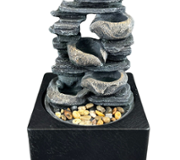 A Pebble Falls Water Fountain. Designed with layered rock-effect tiers, water gently cascades down through the formation, creating a tranquil flow that is both soothing to the ear and pleasing to the eye. The addition of decorative pebbles at the base enhances its natural charm, making it a delightful accent piece.