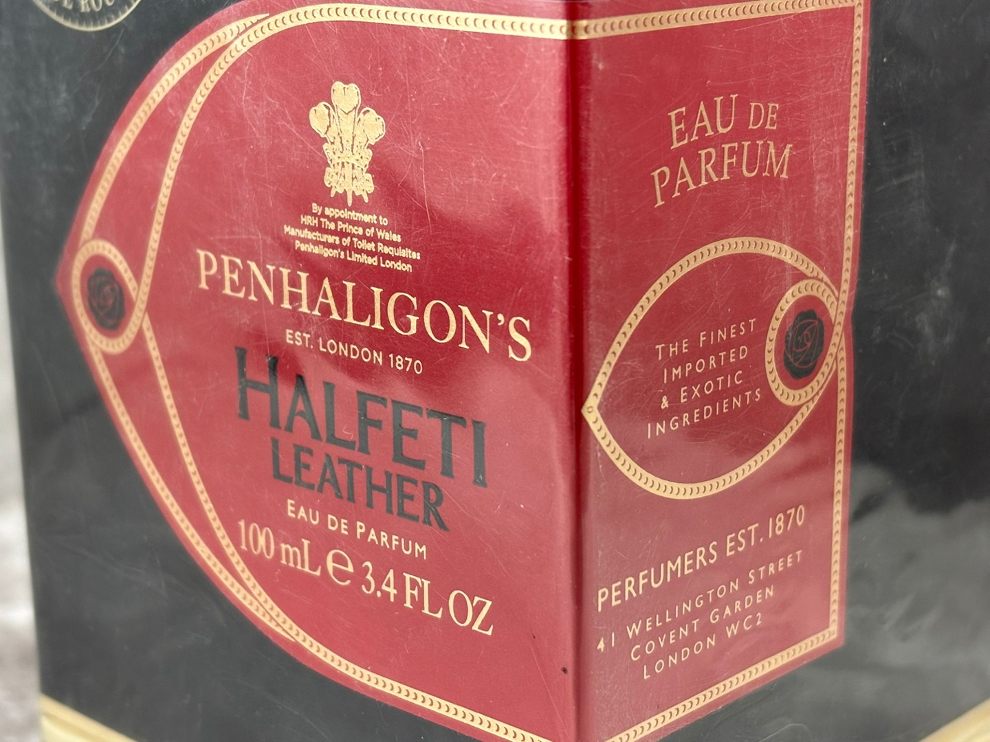 A bottle of Penhaligon's Halfeti Leather Eau De Parfum in a presentation box.