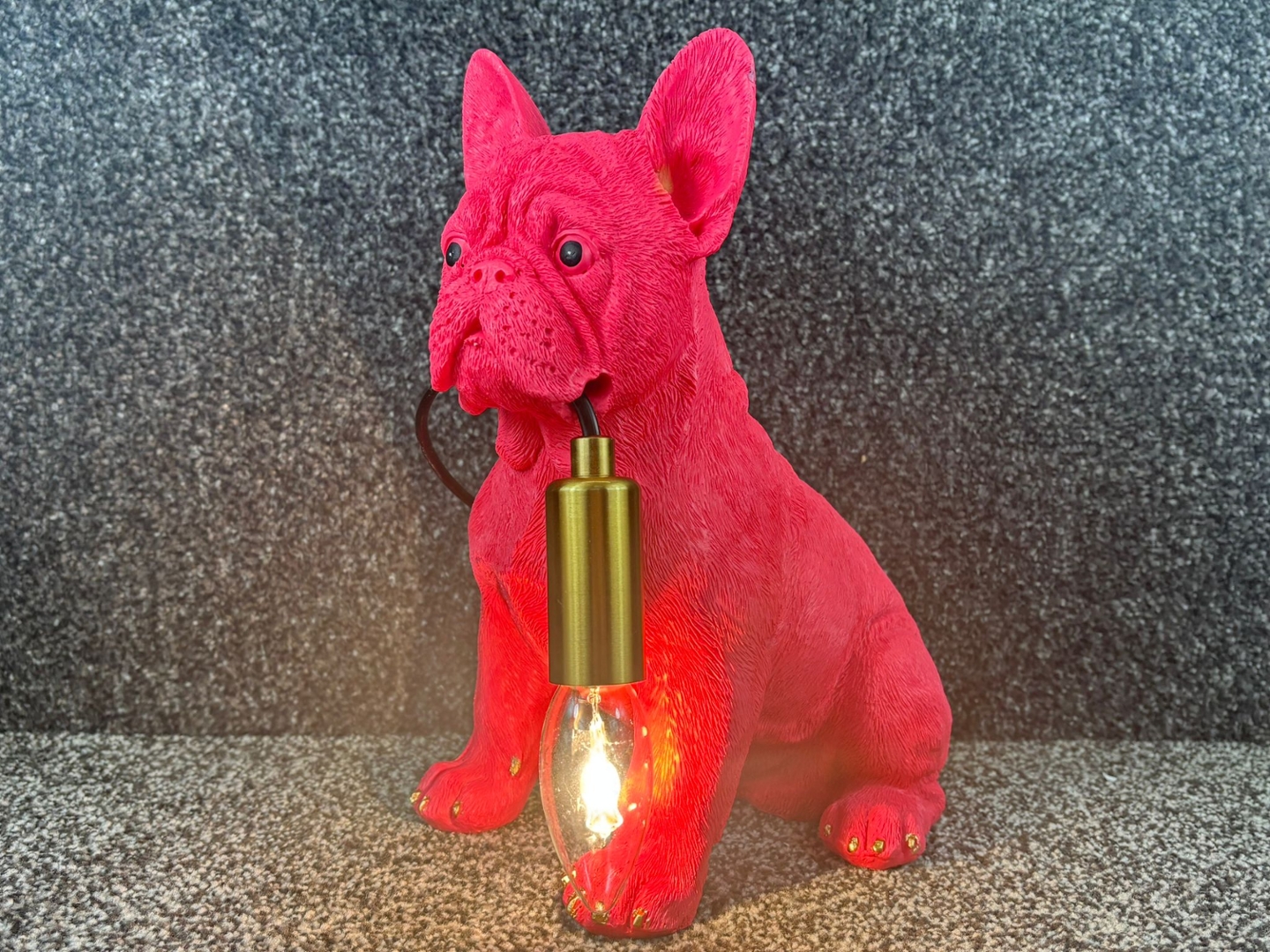 A pink sitting French Bulldog table lamp that combines playful charm with modern decorative flair. This quirky and eye-catching piece is designed in the shape of a French Bulldog holding a bulb fitting in its mouth, creating a fun yet functional lighting solution. The bold pink finish brings a vibrant pop of colour, while the intricate detailing on the fur and features captures the character of the beloved breed.