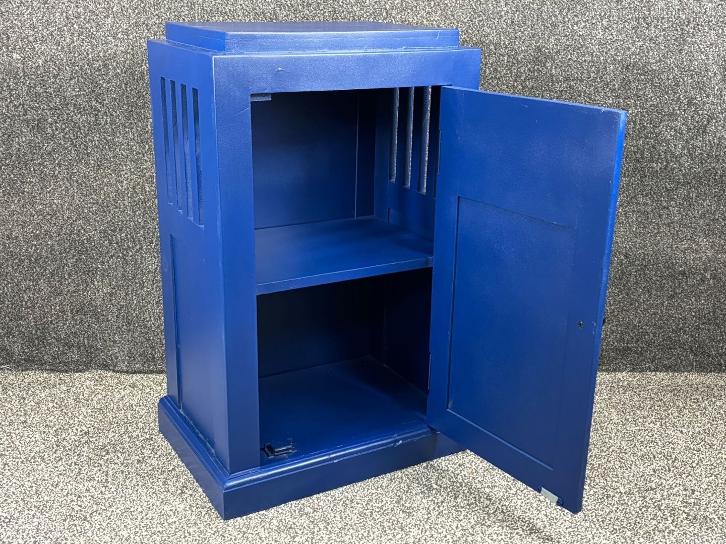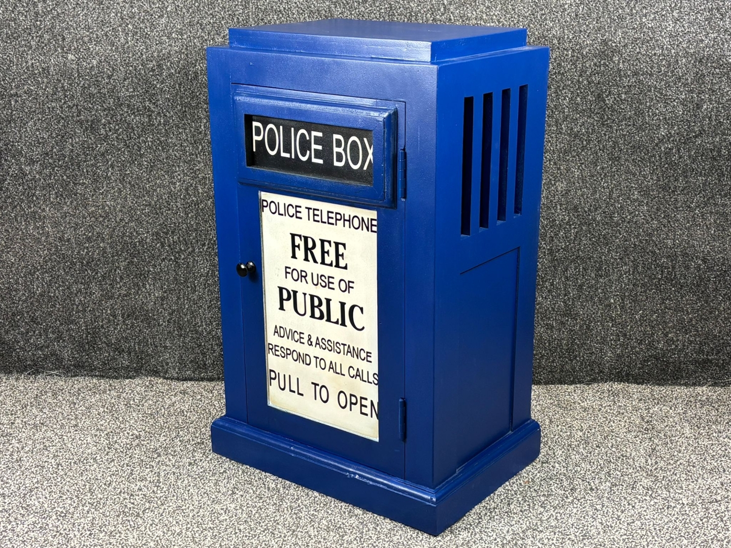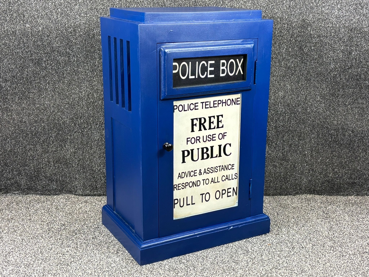 A Police Box Style Side Table Cabinet. Approx 73cm height, 44cm width, 31cm depth.