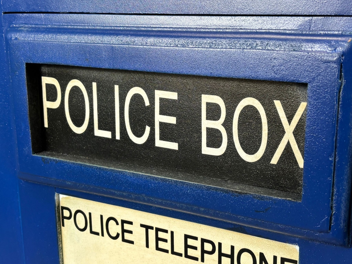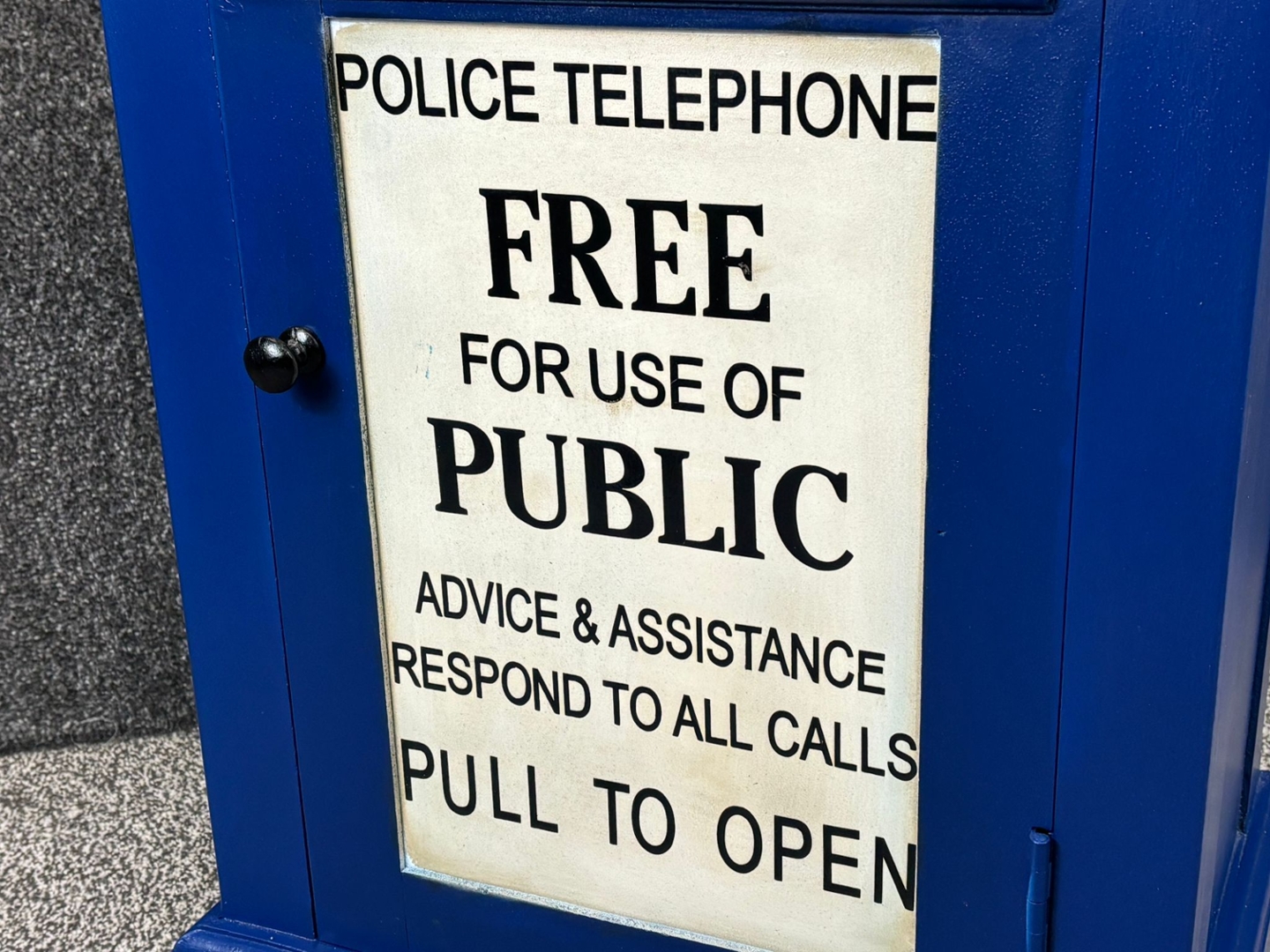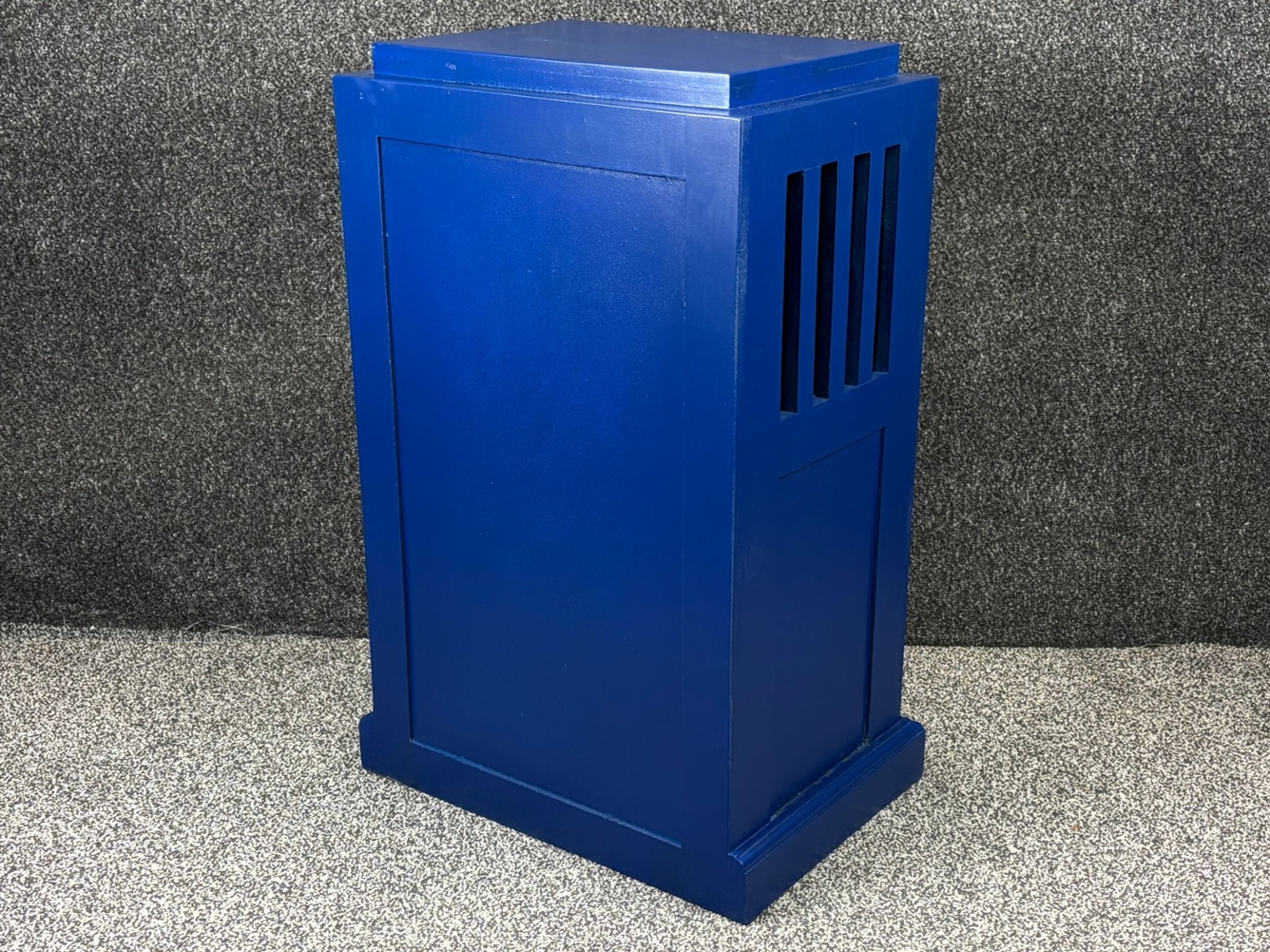 A Police Box Style Side Table Cabinet. Approx 73cm height, 44cm width, 31cm depth.