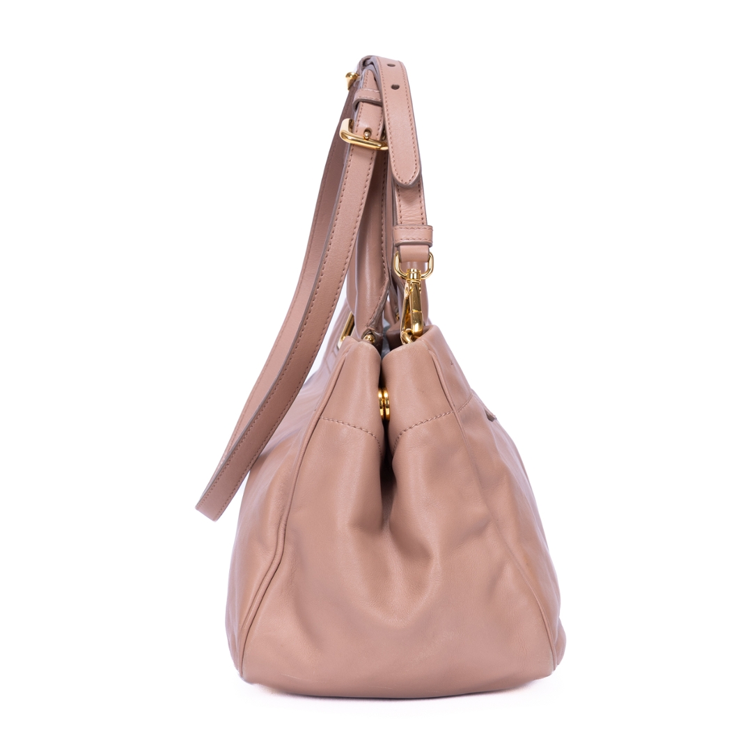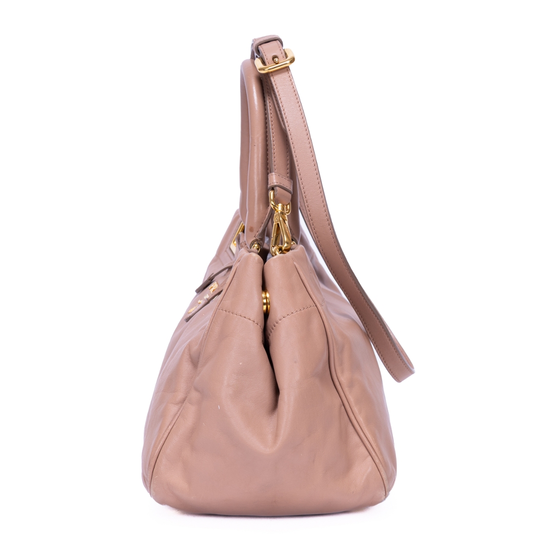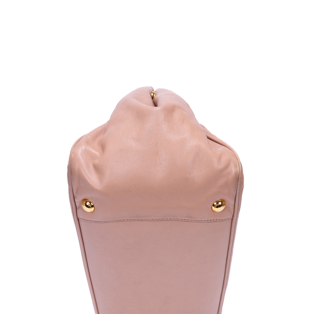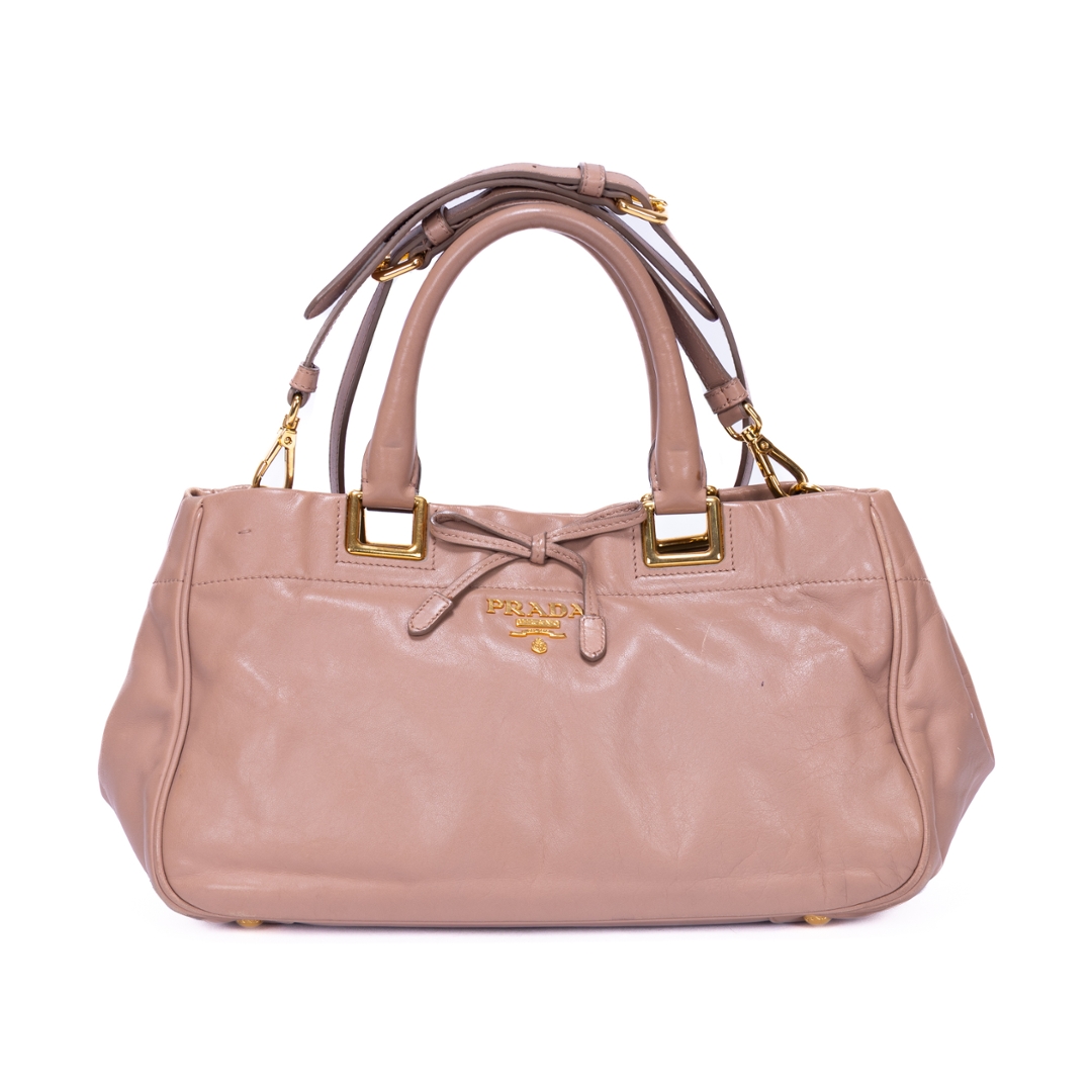 A vintage Prada pink beige calf leather Bow Tote bag with a certificate of authenticity. Approximately 18cm height, 30cm width.