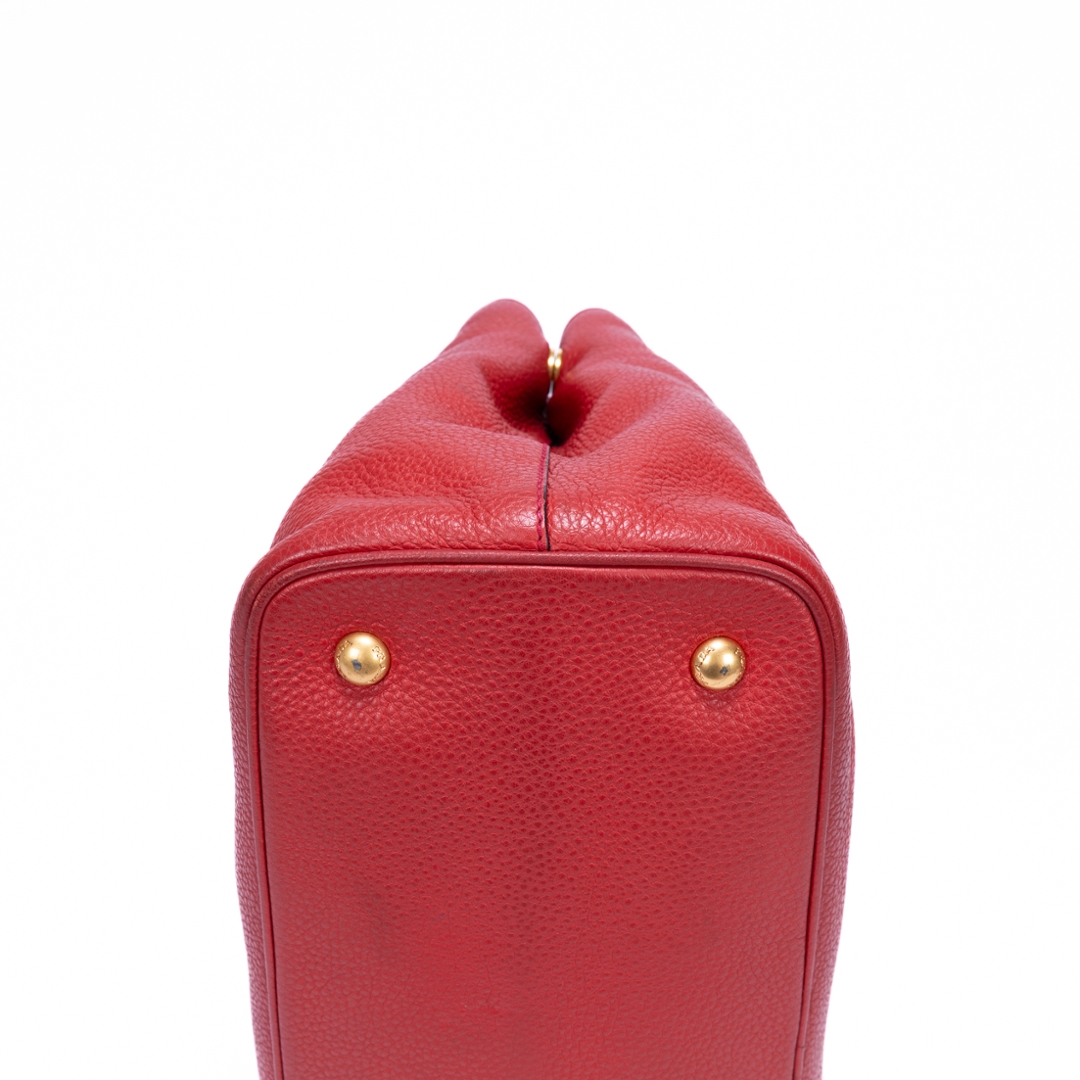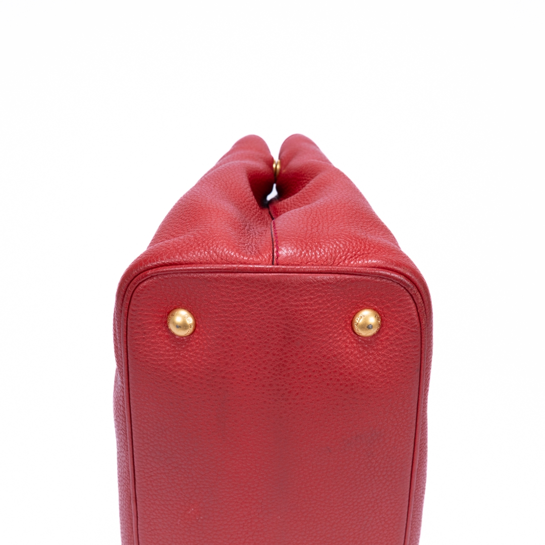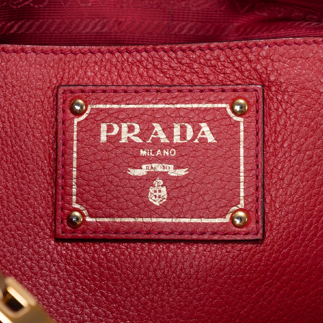 A vintage Prada red calf leather Cabas Crossbody Tote bag with a certificate of authenticity. Approximately 23cm height, 31cm width.