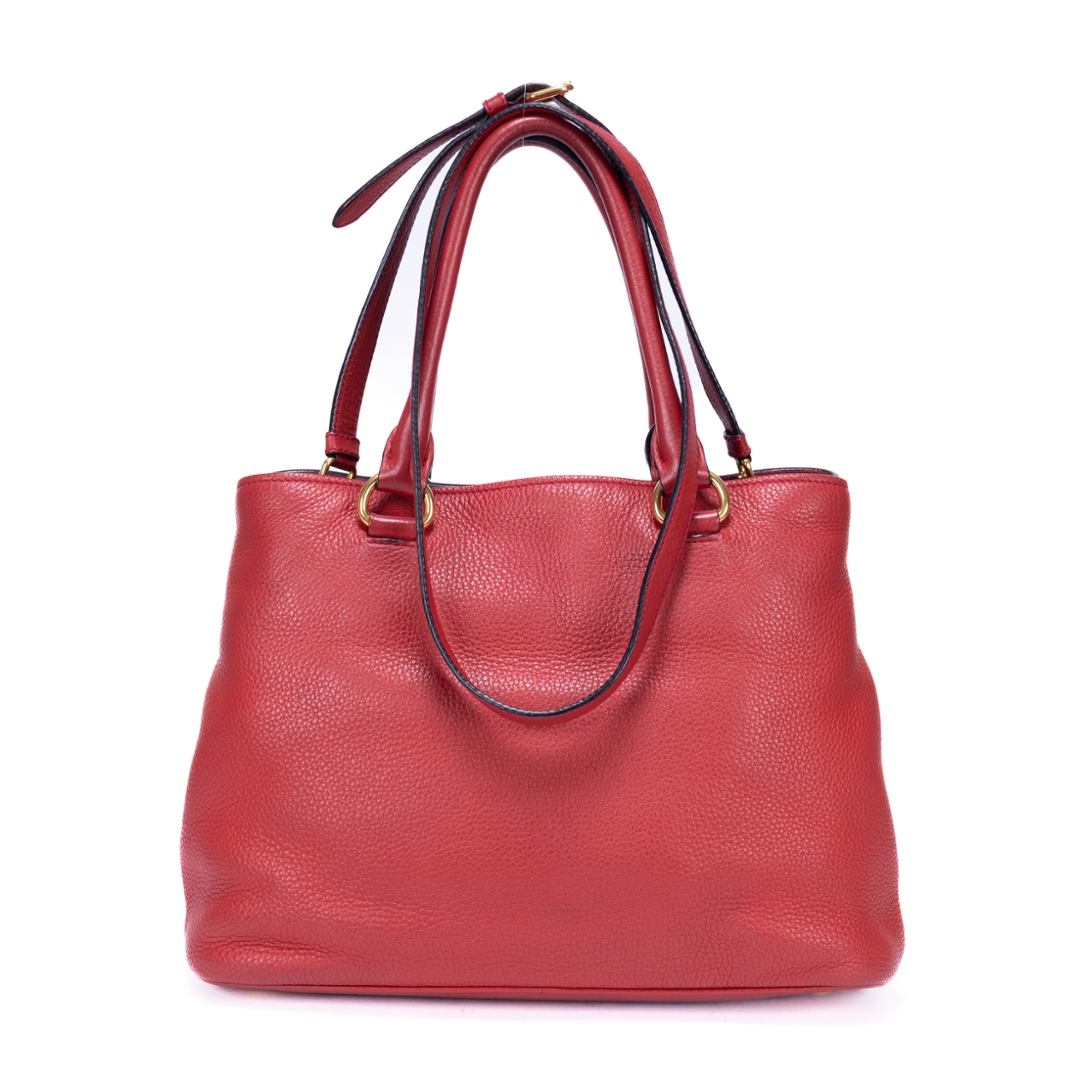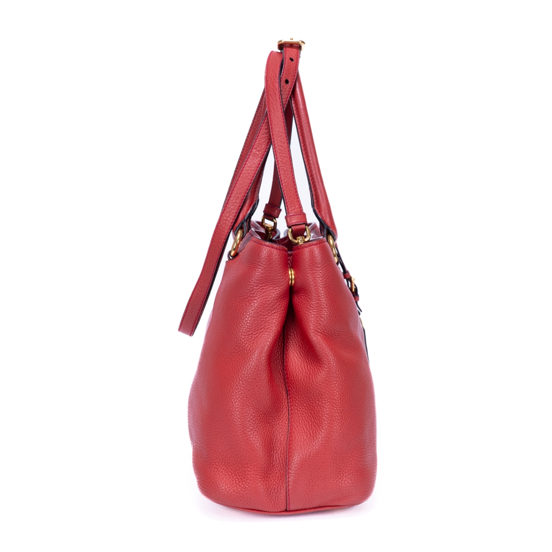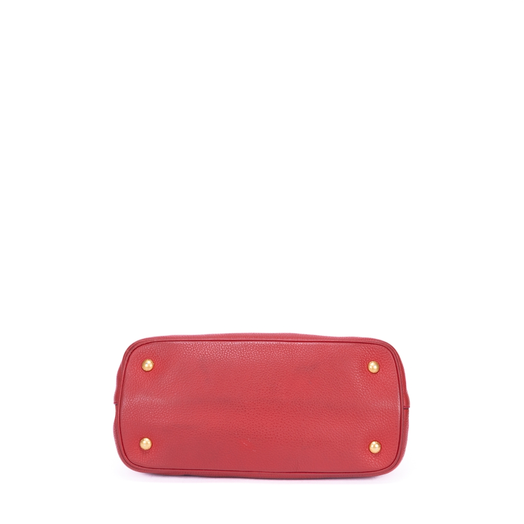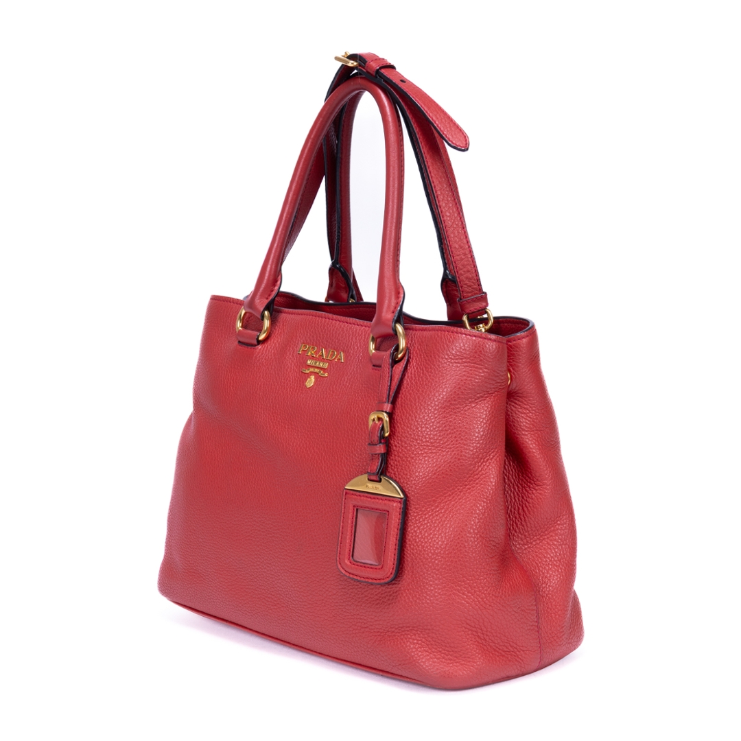 A vintage Prada red calf leather Cabas Crossbody Tote bag with a certificate of authenticity. Approximately 23cm height, 31cm width.