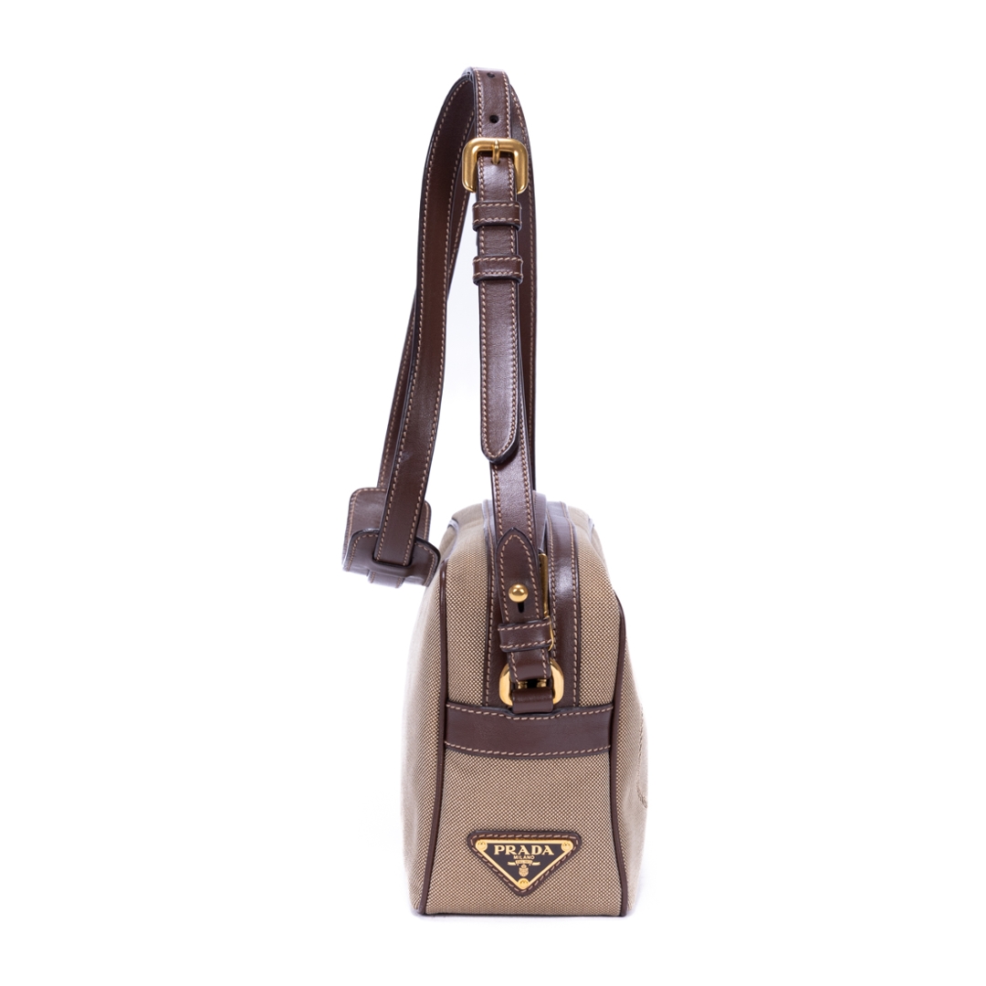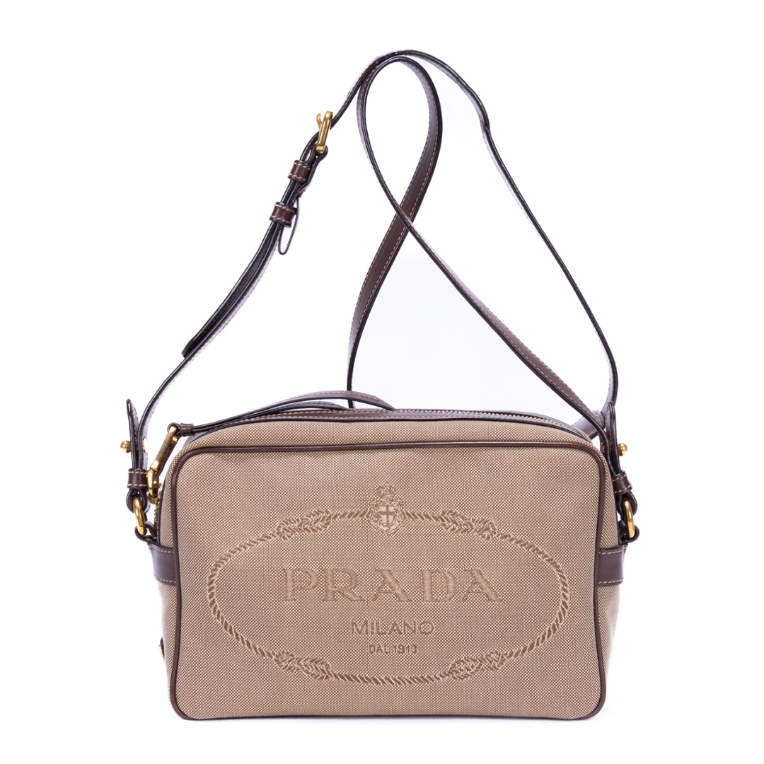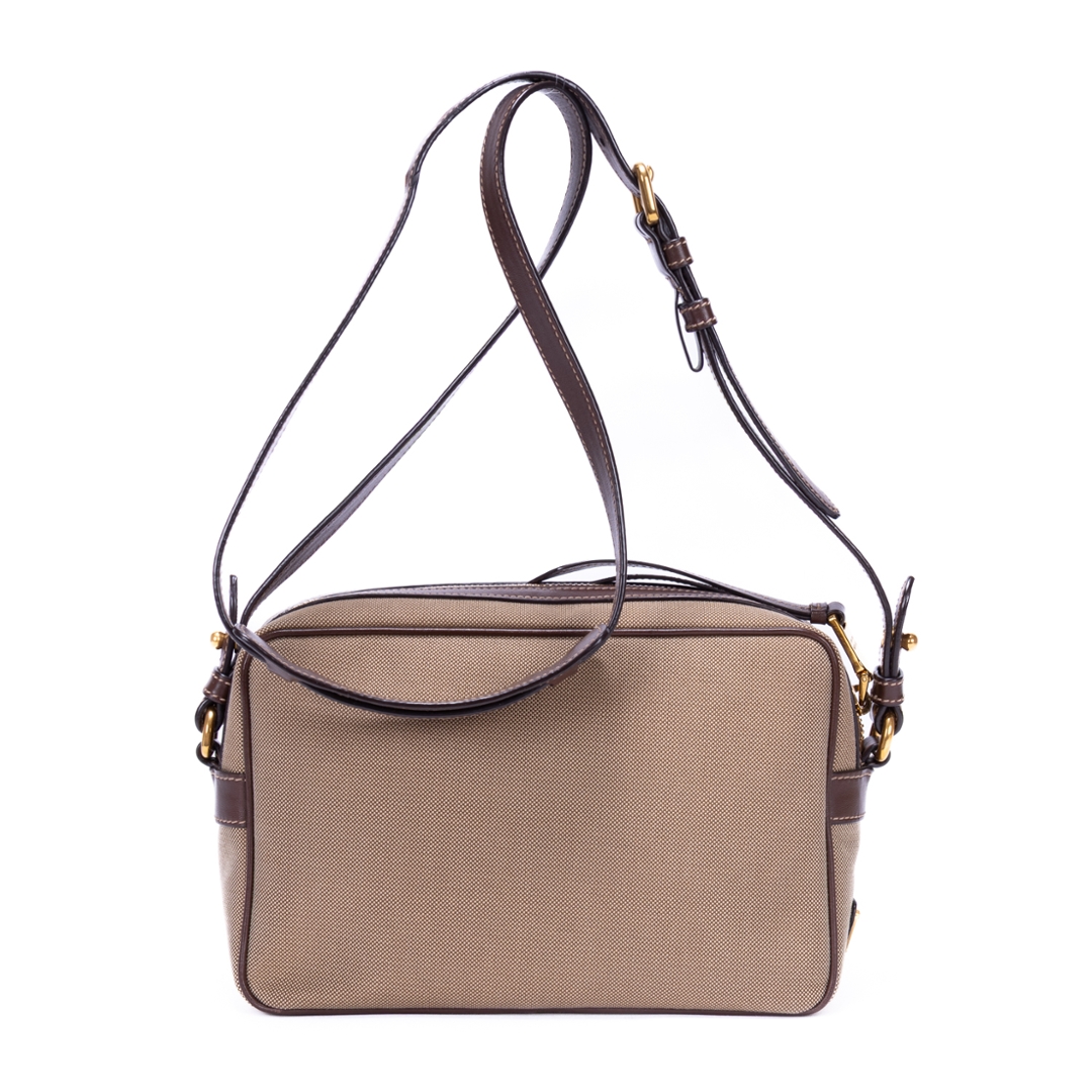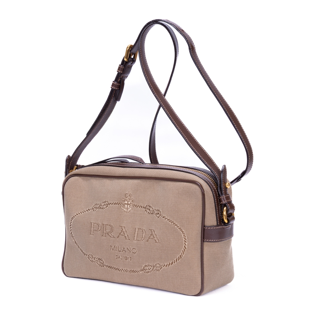 A vintage Prada beige/brown calf leather Camera Bag with a certificate of authenticity. Approximately 15cm height, 23cm width.