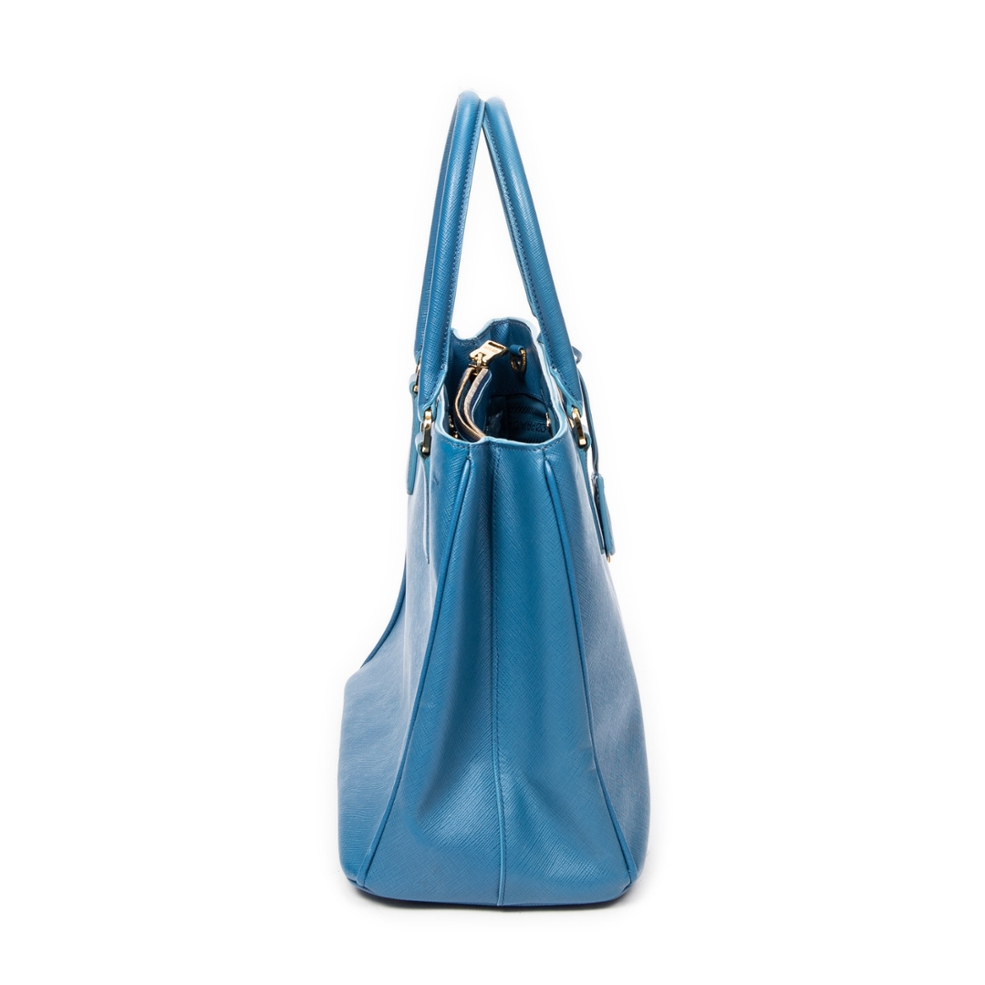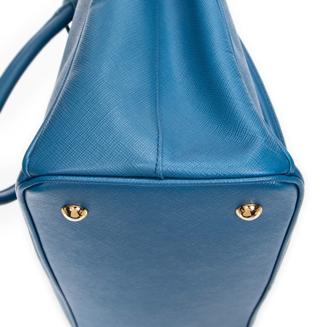 A vintage Prada blue calf leather Medium Galleria Tote bag with a certificate of authenticity. Approximately 23cm height, 33cm width.