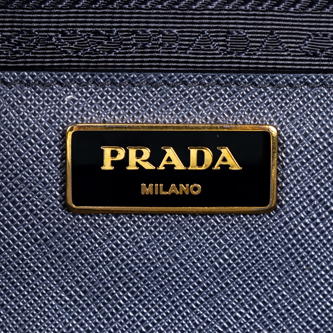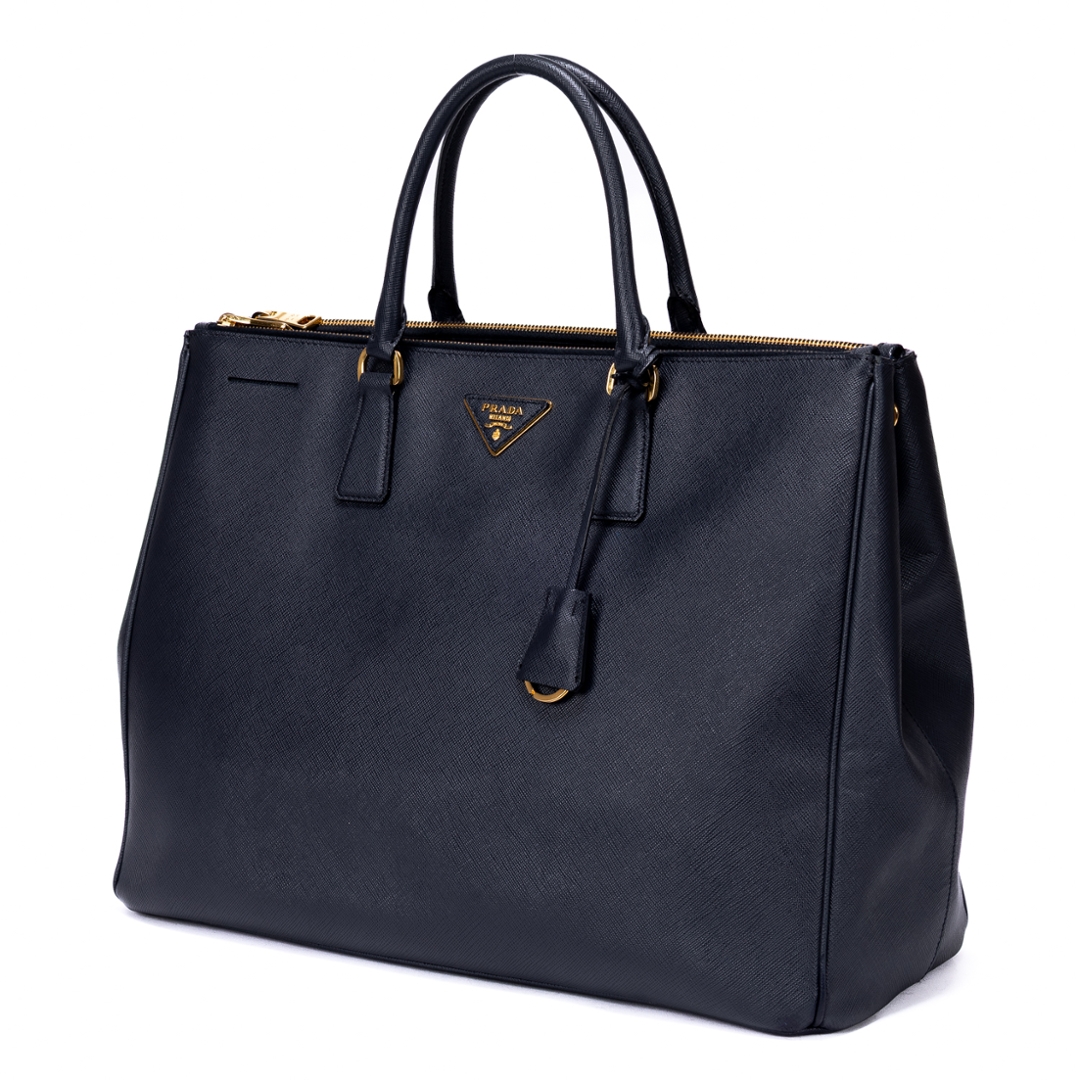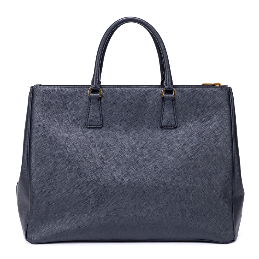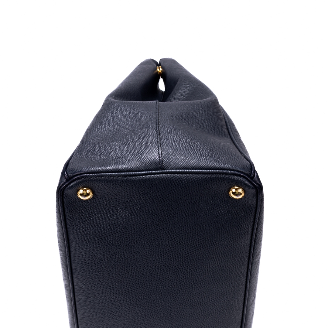 A vintage Prada navy calf leather Saffiano Lux Double Zip Large Tote bag with a certificate of authenticity. Approximately 29cm height, 40cm width.