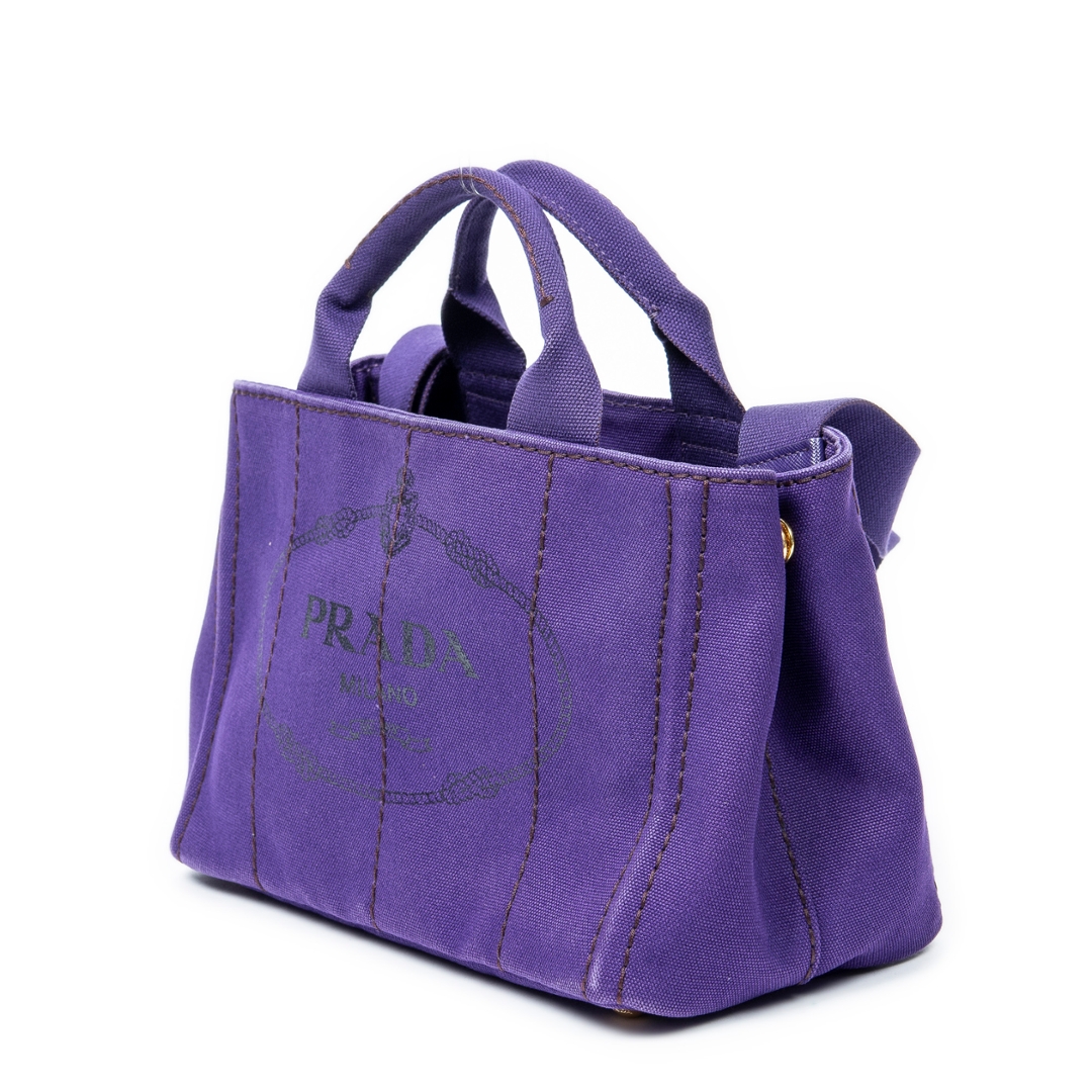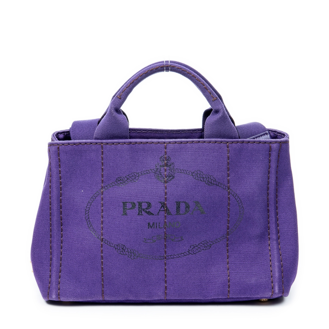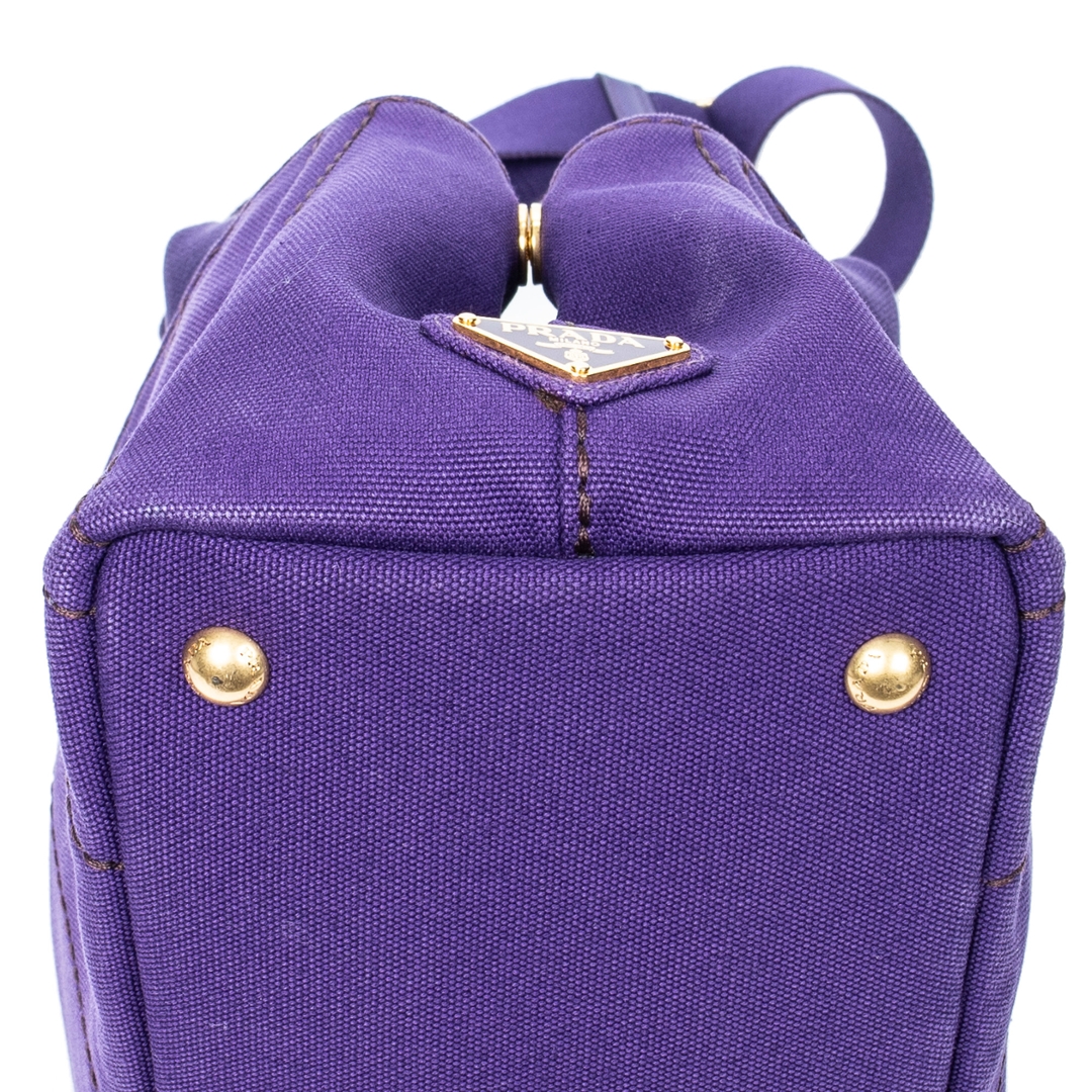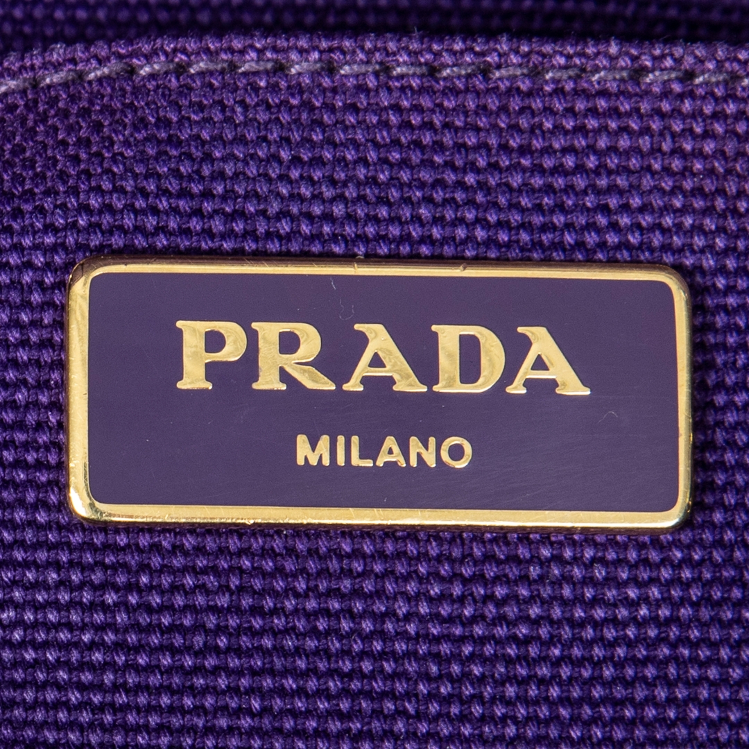 A vintage Prada purple canvas Small Canapa Tote bag with a certificate of authenticity, Approximately 18cm height, 28cm width.