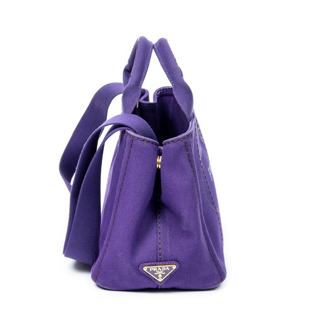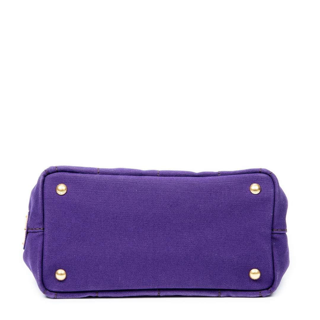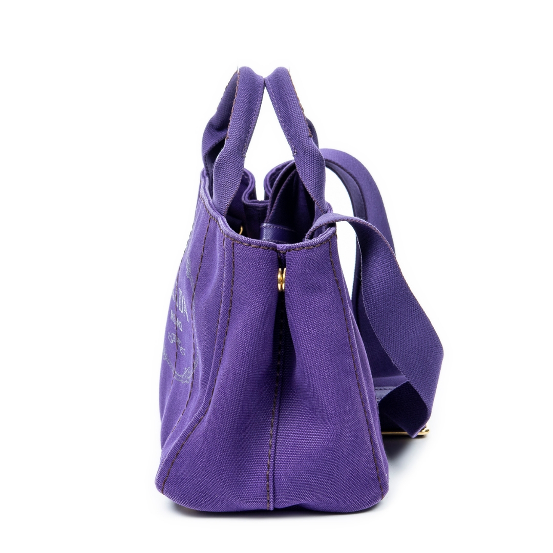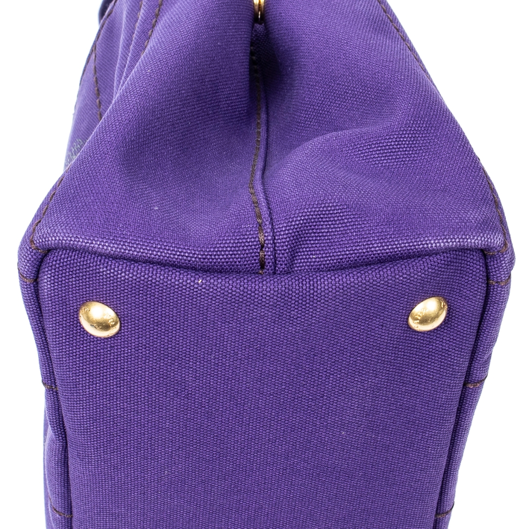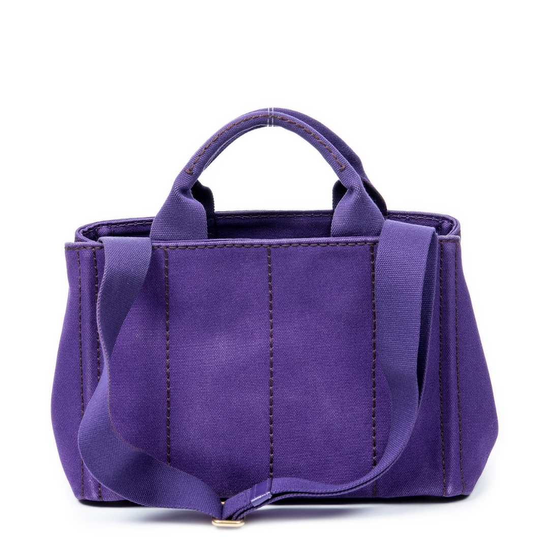 A vintage Prada purple canvas Small Canapa Tote bag with a certificate of authenticity, Approximately 18cm height, 28cm width.