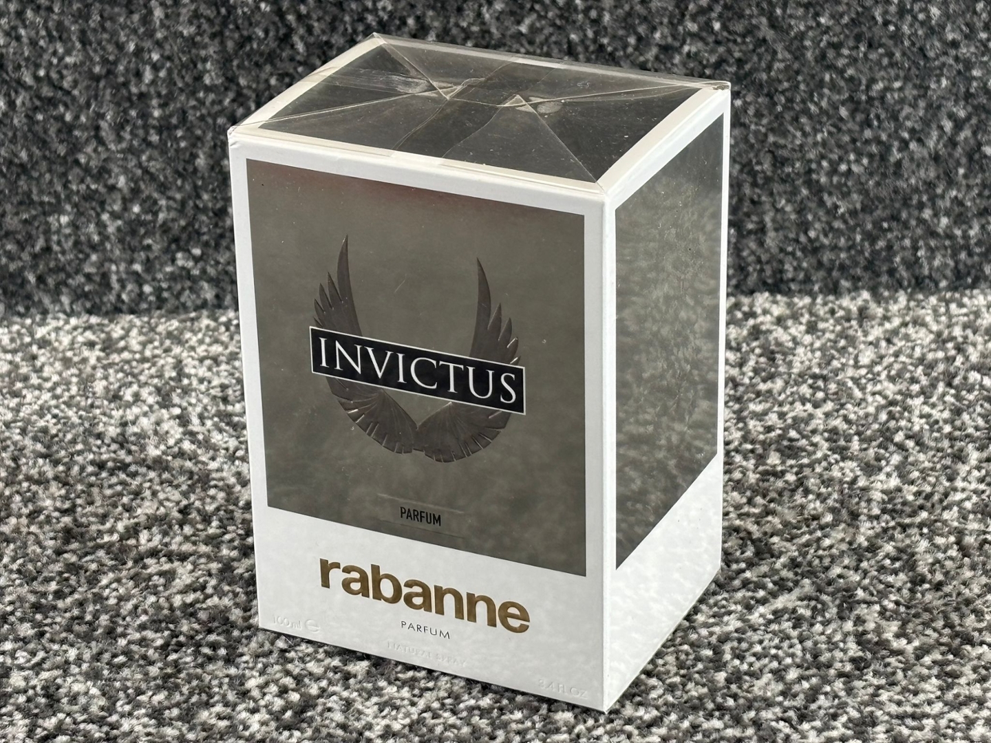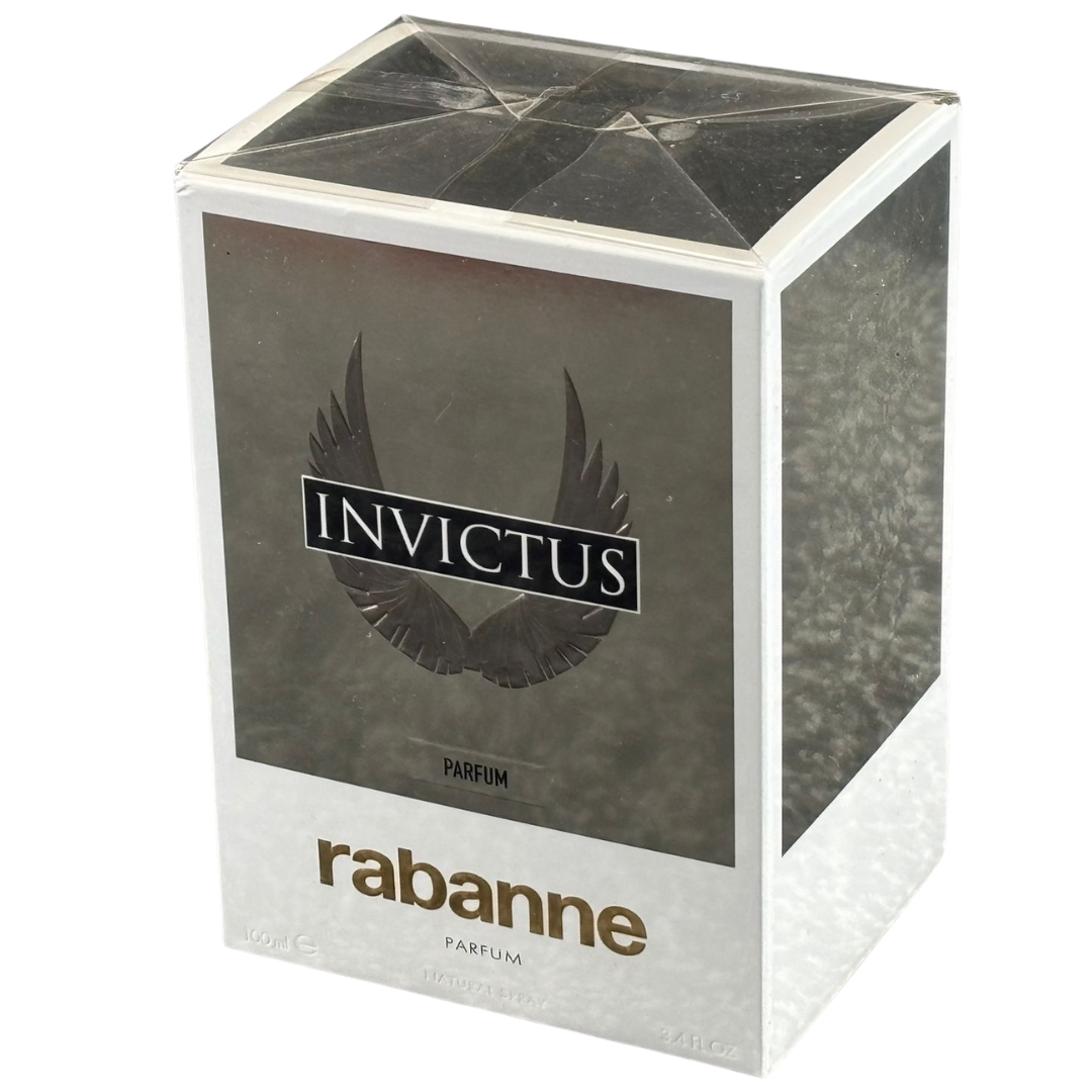 A 100ml bottle of Rabanne Invictus Parfum, presented in its