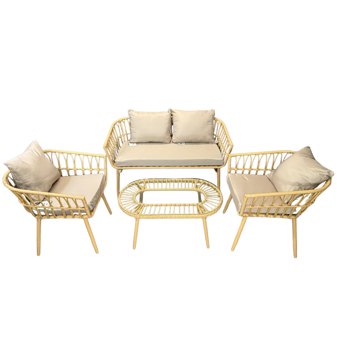 A four-piece rattan garden set is the perfect choice for outdoor relaxation and stylish entertaining. Beautifully designed with a natural woven effect, it includes a cushioned bench, two dining chairs, and a matching tempered glass table — creating a welcoming space for morning coffee, summer lunches, or evening gatherings.