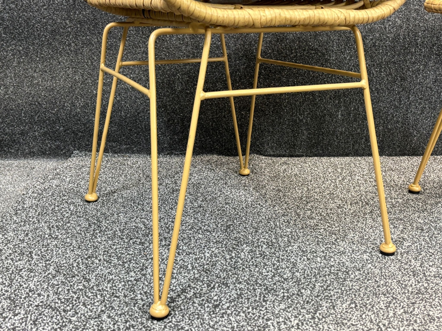 Each chair measures 60cm in height and 70cm in width, featuring soft beige cushions that provide exceptional comfort and support. The open, rounded rattan frame design adds a modern yet relaxed aesthetic, complementing any patio, balcony, or garden décor. The matching table, standing 45cm high and 80cm wide, is topped with durable tempered glass, providing a smooth and stable surface for everyday use.