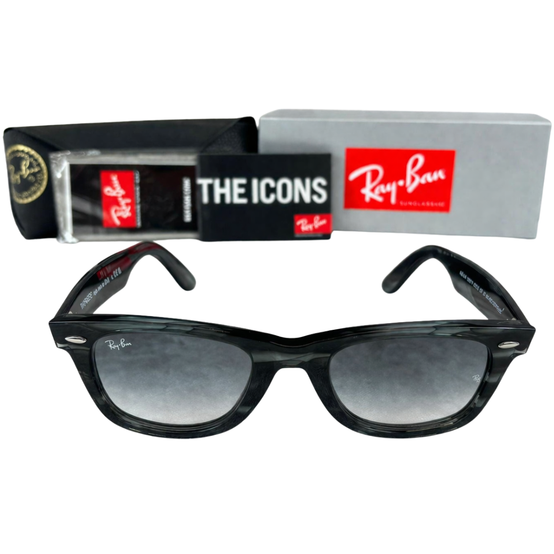 A brand new, unused and boxed pair of Ray-Ban RB2140 136071 sunglasses, presented in a sleek striped grey finish that offers a modern and versatile take on a timeless silhouette. This refined colourway enhances the iconic Wayfarer design, delivering understated character while remaining effortlessly wearable across a range of styles and occasions.