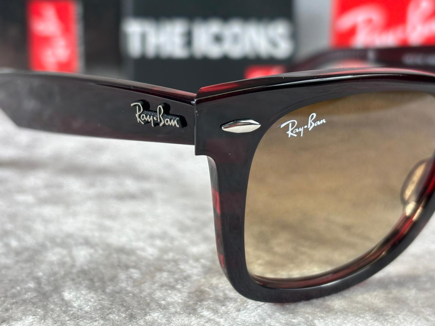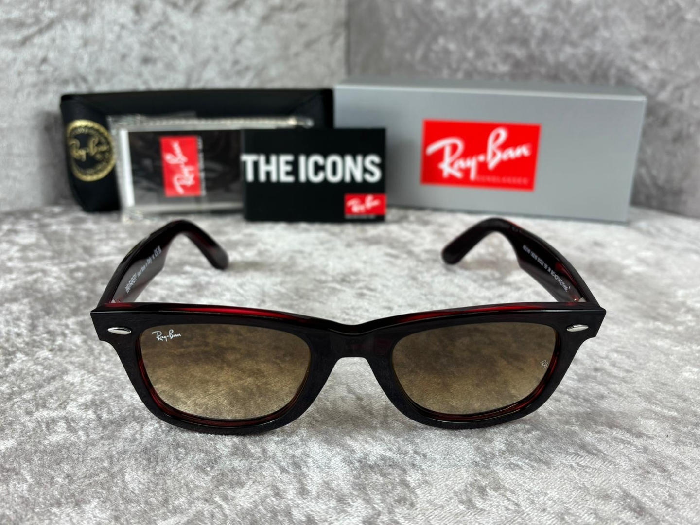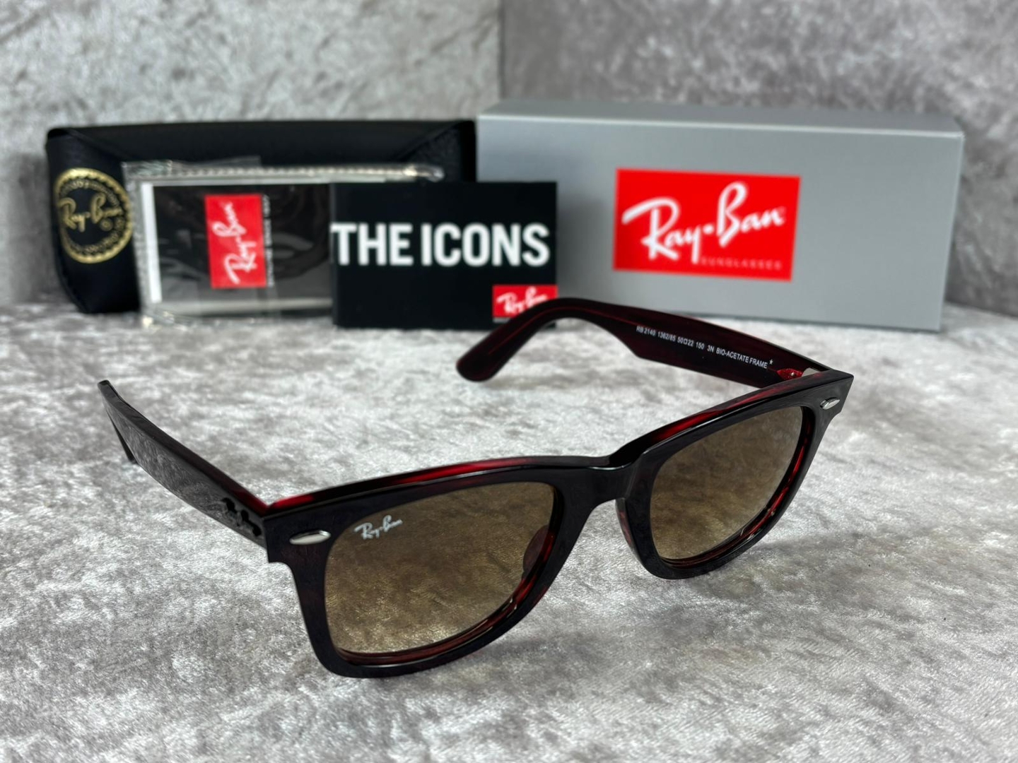 A brand new, unused and boxed pair of Ray-Ban RB2140 136285 sunglasses, showcasing a bold striped red and brown frame that delivers a striking and contemporary twist on a timeless silhouette. This distinctive colourway adds depth and personality while maintaining the instantly recognisable appeal of the classic Wayfarer design, making it a standout accessory for any collection.