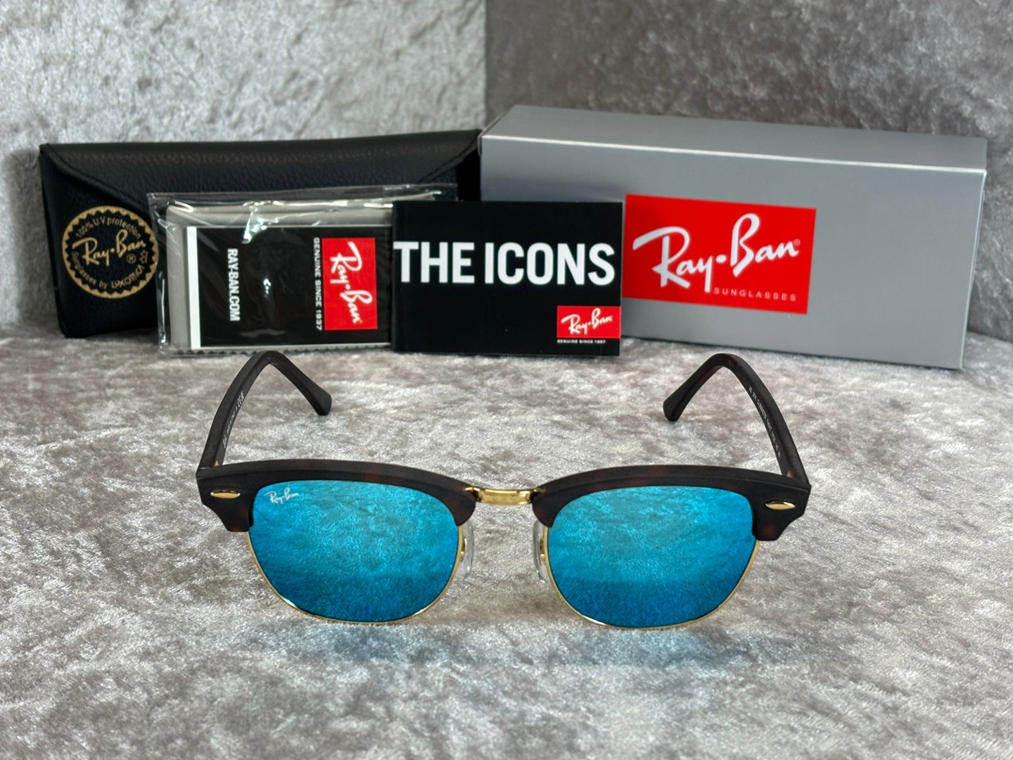 A brand new, unused and boxed pair of Ray-Ban RB3016 1145/17 Havana/Blue sunglasses, bringing a vibrant twist to one of Ray-Ban’s most iconic designs. The classic Clubmaster shape is elevated with a rich Havana frame paired beautifully with striking blue mirrored lenses, creating a bold, modern look while maintaining the timeless character the model is known for. With the Ray-Ban signature displayed on the lens, these sunglasses deliver unmistakable authenticity and style.