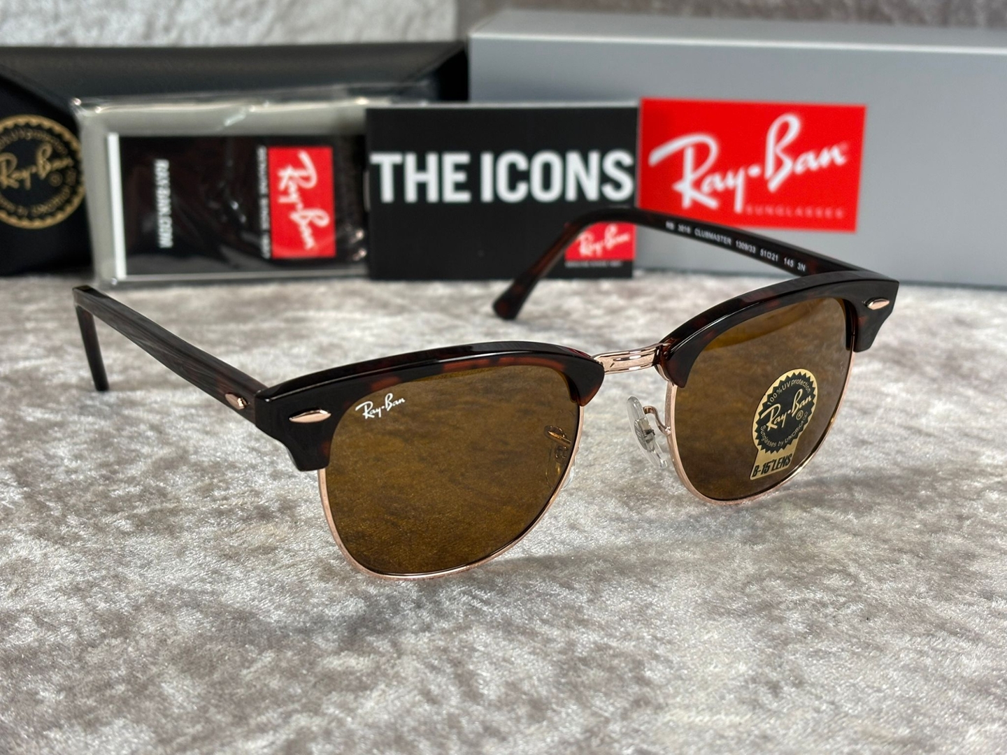 Presented exactly as supplied from new, this set includes the official Ray-Ban box, protective case, cleaning cloth and the full documentation pack. All items appear untouched and factory-fresh, making these sunglasses perfect for gifting or for buyers who value receiving their eyewear in pristine condition.